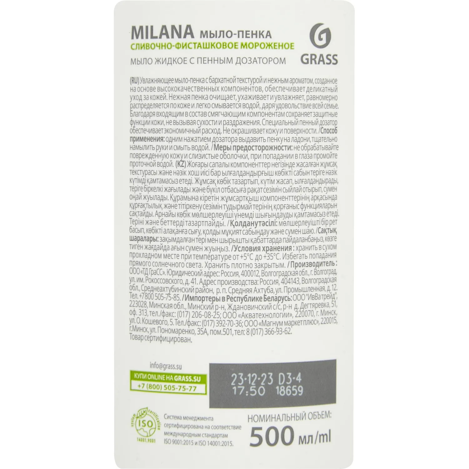 О товаре «Мыло-пена Grass Milana Сливочно-фисташковое мороженое 500 мл»