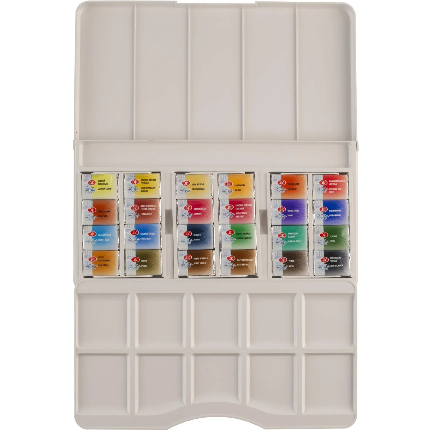 Кюветы по 2.5 мл упакованы в пластиковую коробку с откидной палитрой. Коробка удобна для переноса и использования на выезде. В коробке предусмотрены места для дополнительных кювет. Это позволяет расширить палитру цветов по мере необходимости.