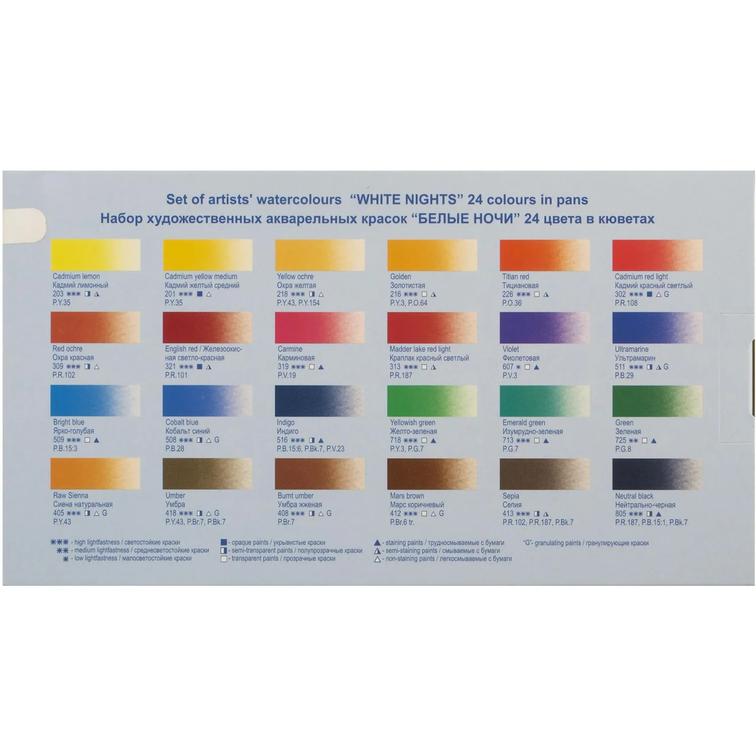 В набор входят следующие цвета: 203 кадмий лимонный, 201 кадмий жёлтый средний, 218 охра жёлтая, 216 золотистая, 226 тициановая, 309 охра красная, 302 кадмий красный светлый, 319 карминовая, 313 краплак красный светлый, 321 железноокисная светло-красная, 607 фиолетовая, 516 индиго, 511 ультрамарин, 508 кобальт синий, 509 ярко-голубая, 718 желто-зелёная, 713 изумрудно-зелёная, 725 зелёная, 405 сиена натуральная, 418 умбра, 408 умбра жжёная, 412 марс коричневый, 413 сепия, 805 нейтрально-чёрная.