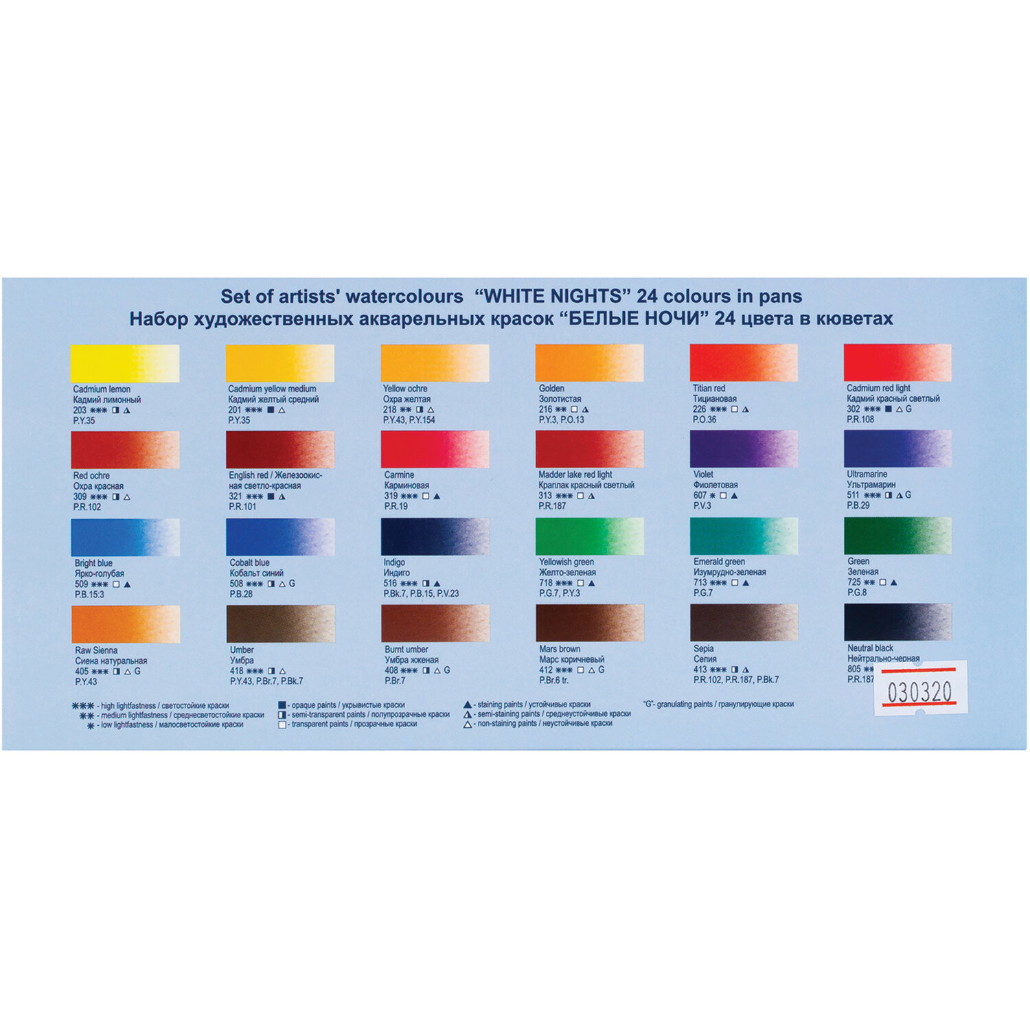 Акварельные краски Белые Ночи используются художниками для создания живописных работ. Эти краски изготавливаются на заводе Невская Палитра. Они подходят как для студийной работы, так и для пленэров. Краски состоят из тонкотёртых пигментов и натурального гуммиарабика.