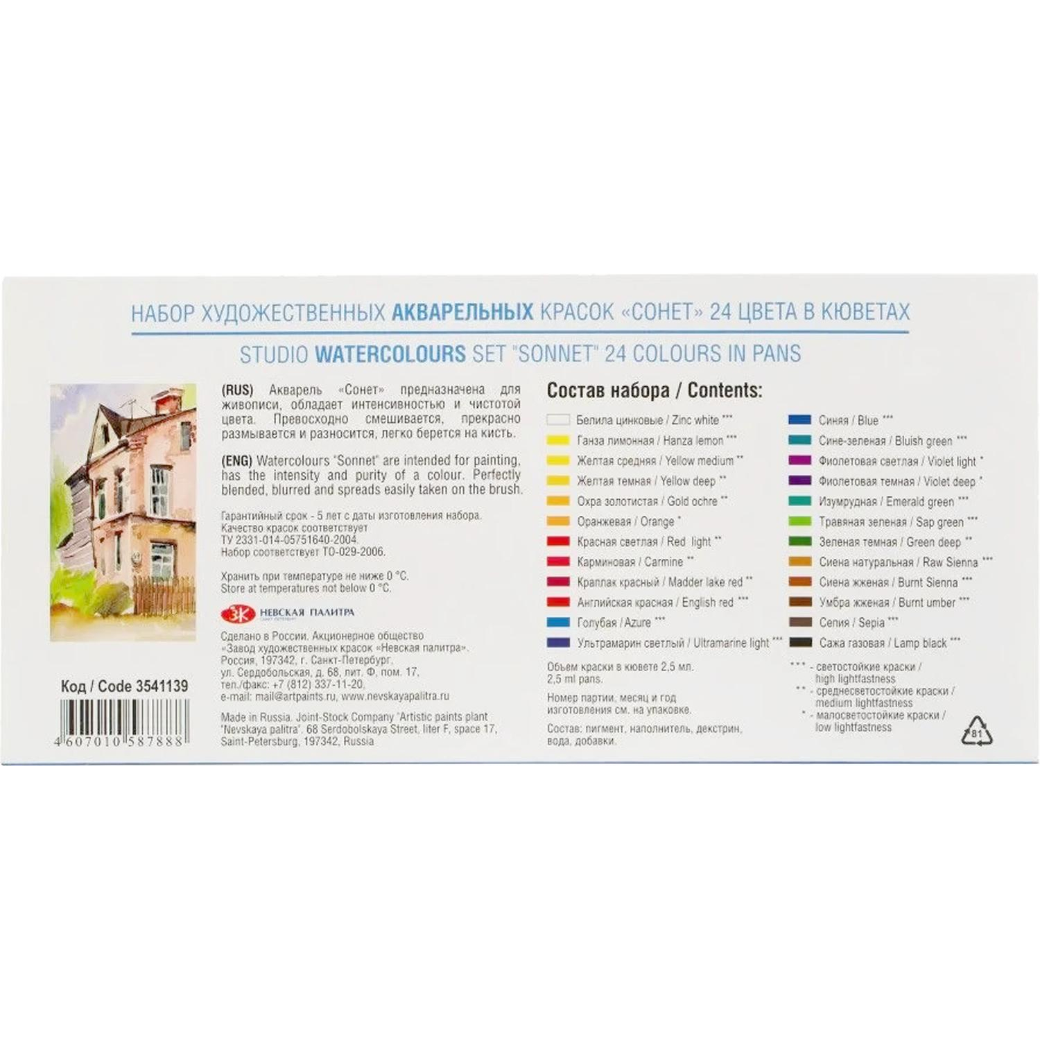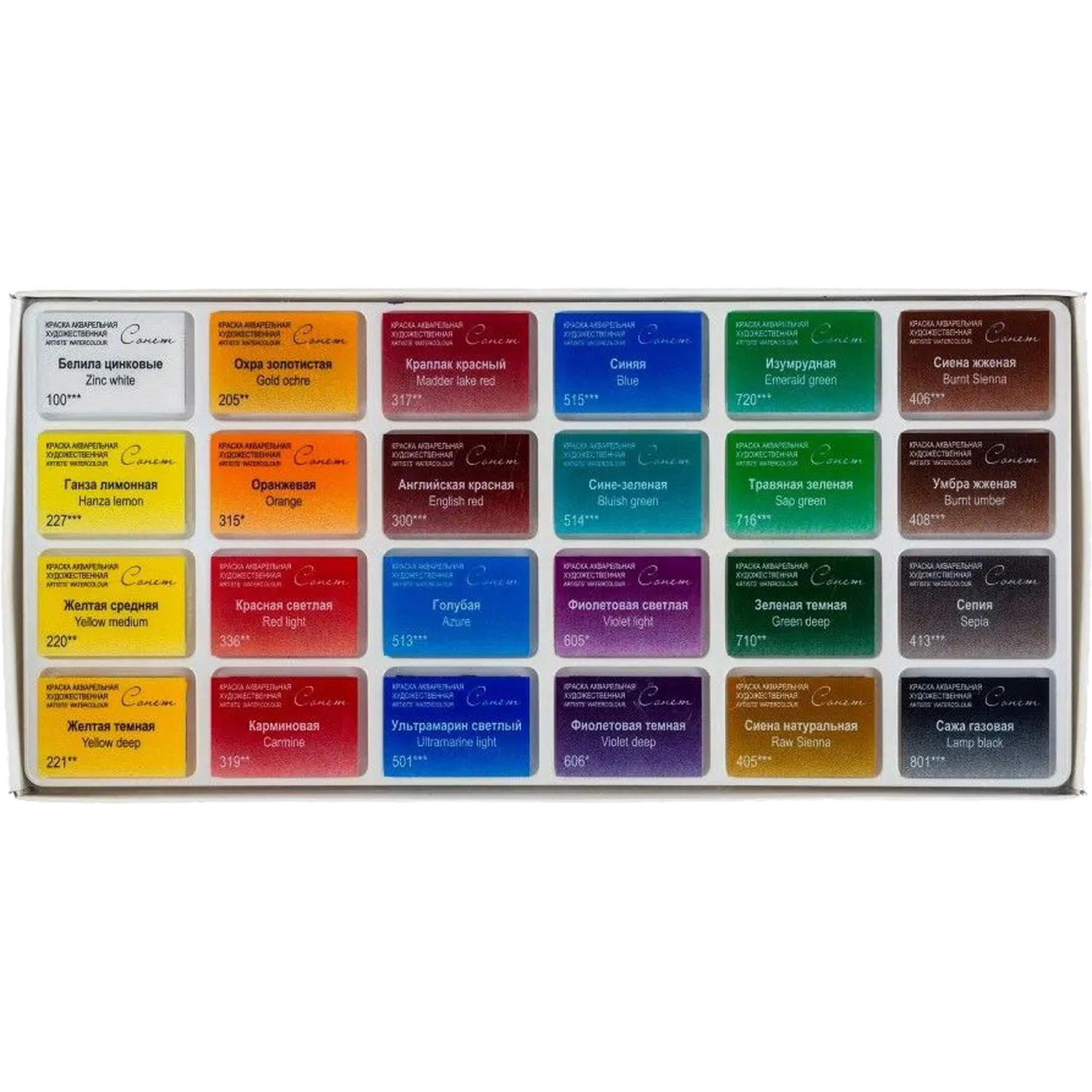 Набор акварельных красок Сонет включает 24 цвета. В набор входят следующие цвета: белила цинковые, ганза лимонная, жёлтая средняя, жёлтая тёмная, охра золотистая, оранжевая, красная светлая, карминовая, краплак красный, английская красная, голубая, ультрамарин светлый, синяя, сине-зелёная, фиолетовая светлая, фиолетовая тёмная, изумрудная, травяная зелёная, зелёная тёмная, сиена натуральная, сиена жжёная, умбра жжёная, сепия, сажа газовая.