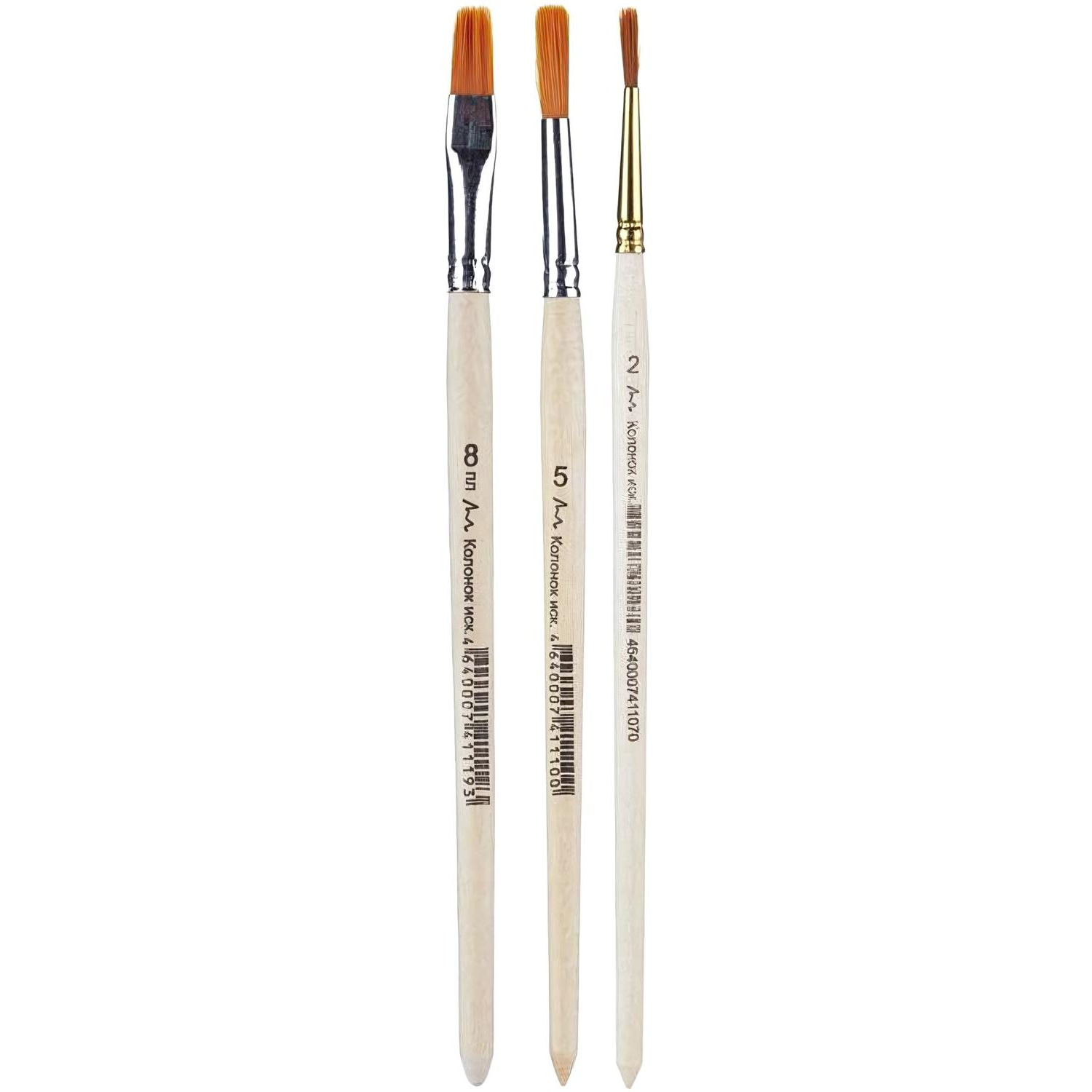 Номера и форма волоса кистей, представленных в наборе: № 2 — круглая, № 5 — круглая, № 8 — плоская.