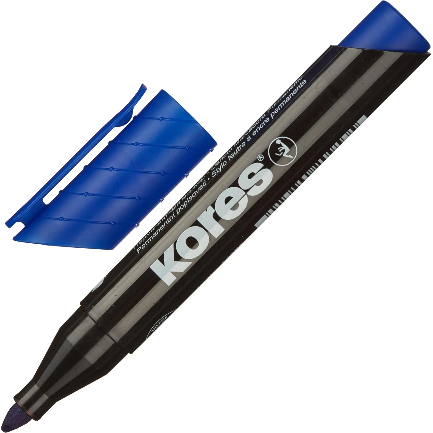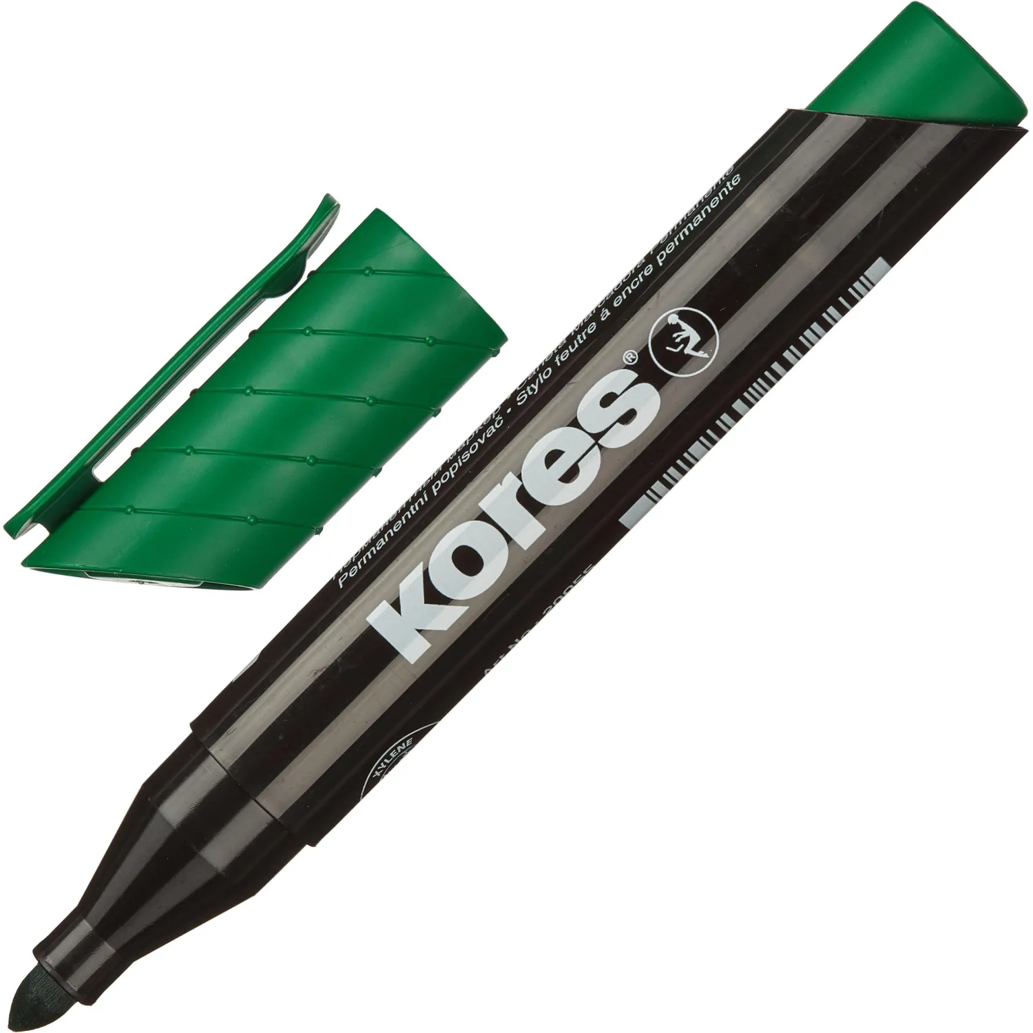 Набор перманентных маркеров Kores 20943 в прозрачной упаковке. Эргономичный корпус маркеров изготовлен из пластика. Круглый наконечник обеспечивает толщину линии от 1.5 до 3 мм. Размеры маркера с колпачком: 145×16 мм, без колпачка: 132×16 мм. Страна производства — Чешская республика. Цвета в наборе — синий, черный, красный, зеленый. Снятый колпачок не потеряется благодаря тому, что во время работы его можно надевать на верхнюю часть маркера. Устойчивость к высыханию при открытом колпачке до 10 дней.