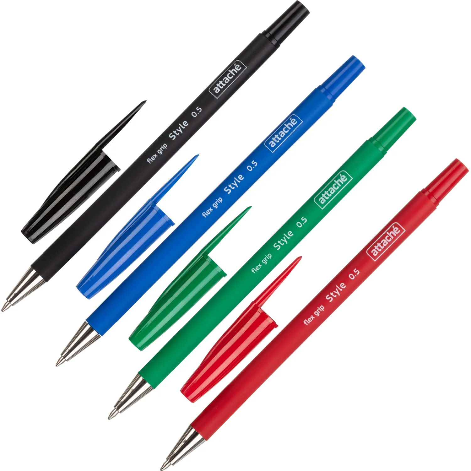 Набор шариковых ручек Attache Style 4 цвета. Модель ручек в прорезиненном корпусе круглой формы создает дополнительный комфорт при письме. Ручка не будет скользить, а также позволит снизить усталость рук. В набор входят следующие цвета чернил: черный, красный, зеленый, синий. Ручки упакованы в прозрачный пластиковый блистер. Металлический шарик в стержне ручки диаметром 0,7 мм и стандартной формой наконечника позволяет оставлять четкую линию письма толщиной 0,5 мм. Прорезиненный корпус и вентилируемый колпачок соответствуют цвету чернил. Сменные стержни для ручки шариковой вы сможете найти во вкладке «Расходные материалы». Набор шариковых ручек Attache Style — необходимый аксессуар для школы и офиса!