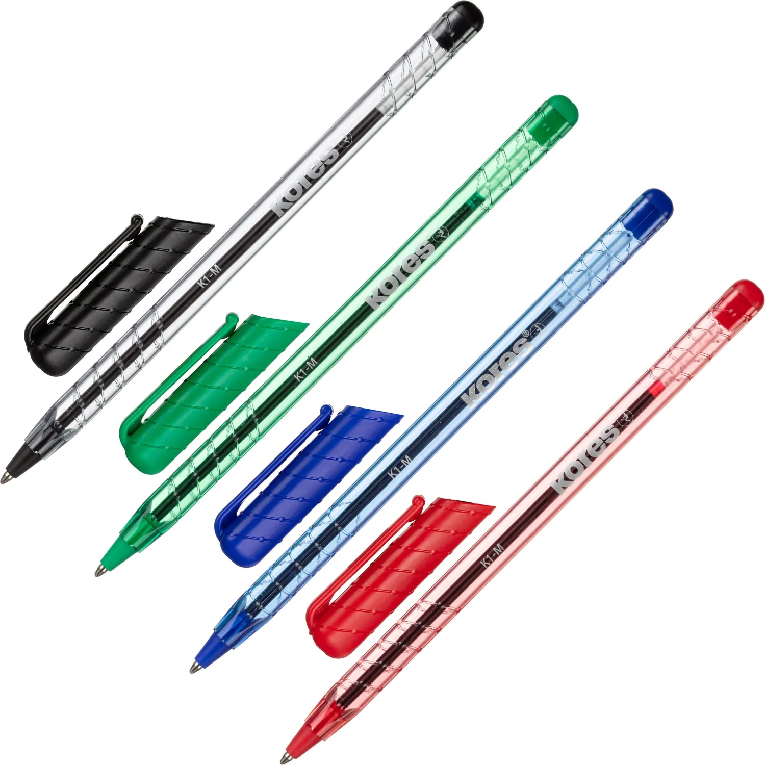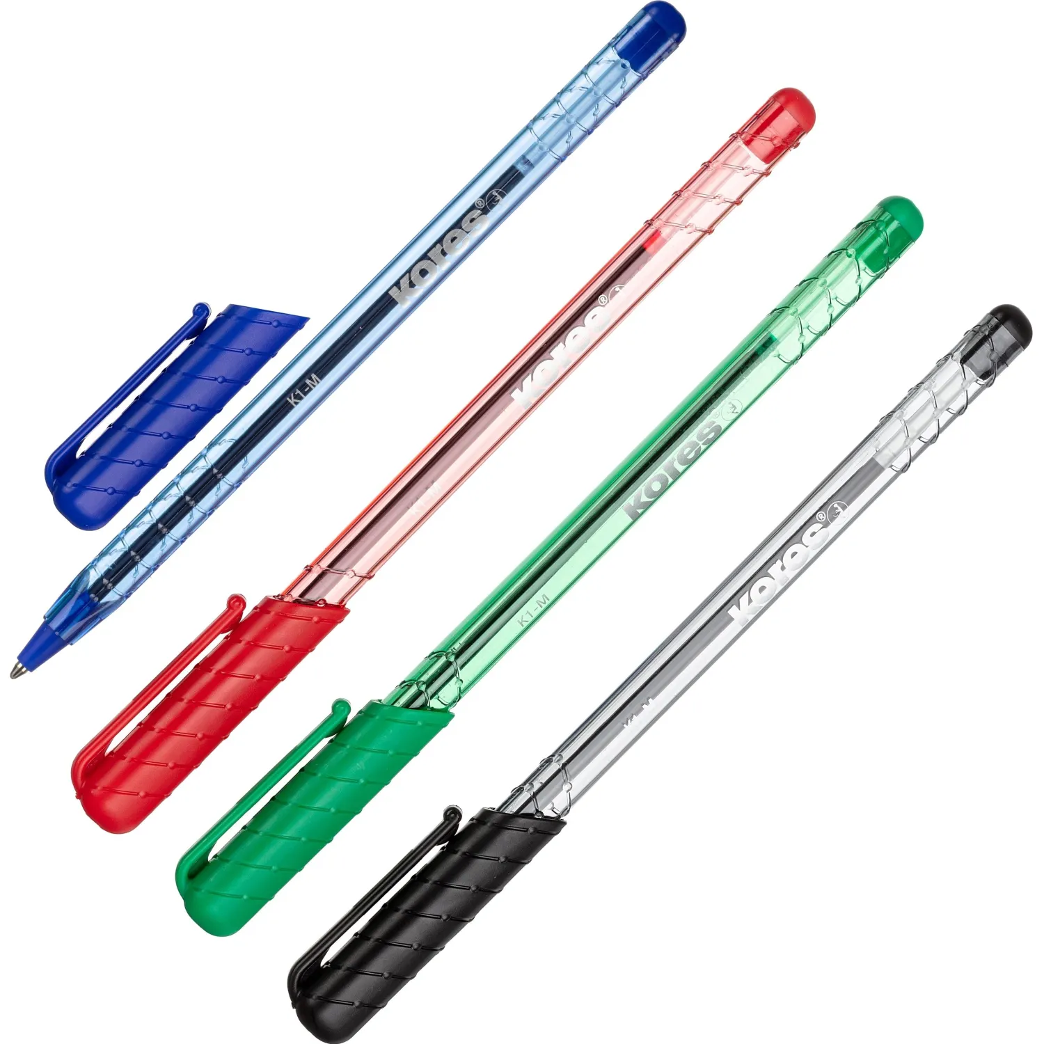 Набор шариковых ручек Kores К1. Имеют трёхгранный корпус, выполненный из прочного пластика. Цвет чернил — синий, чёрный, красный, зёленый. Линия письма — 0,7 мм. В наборе 4 штуки на жёстком блистере.