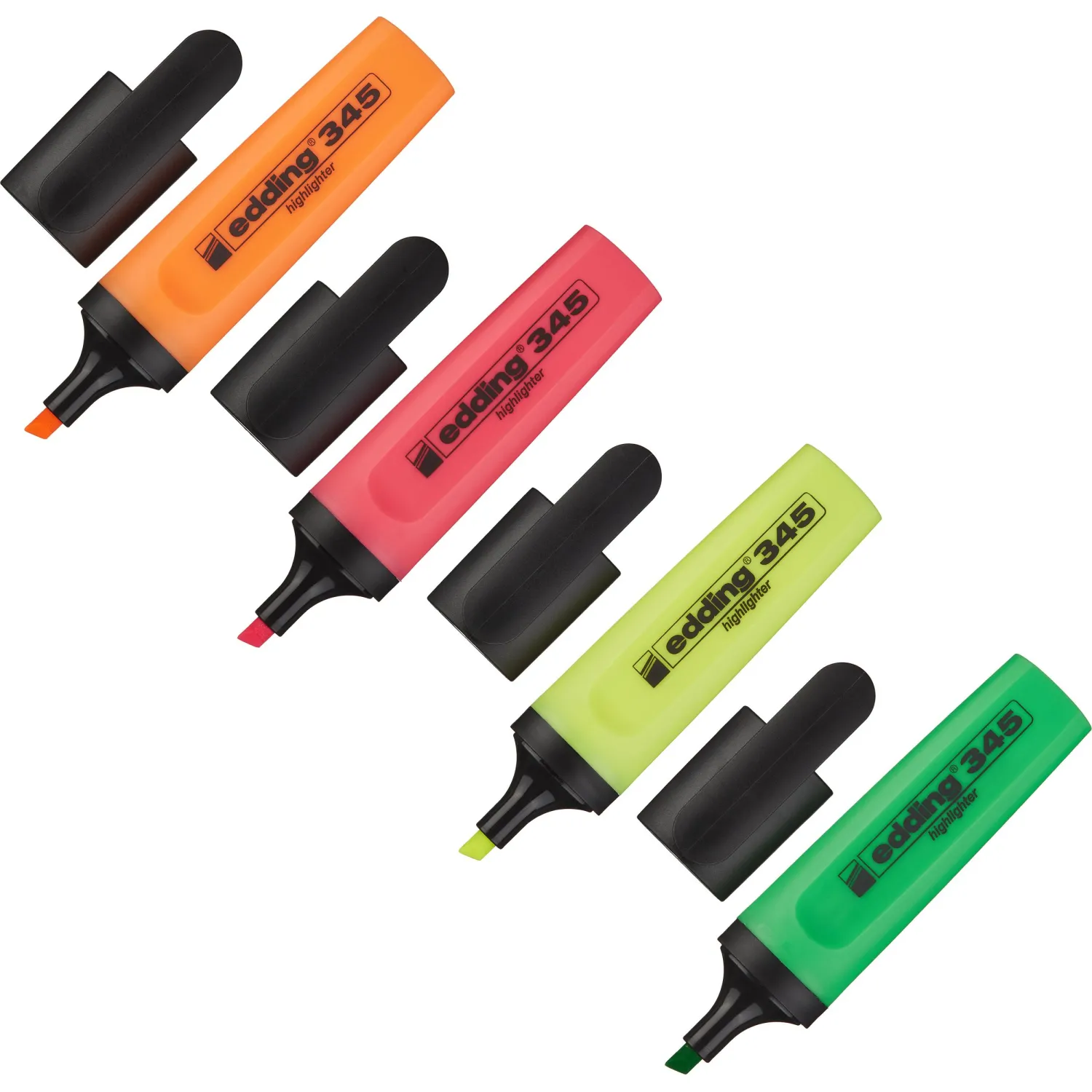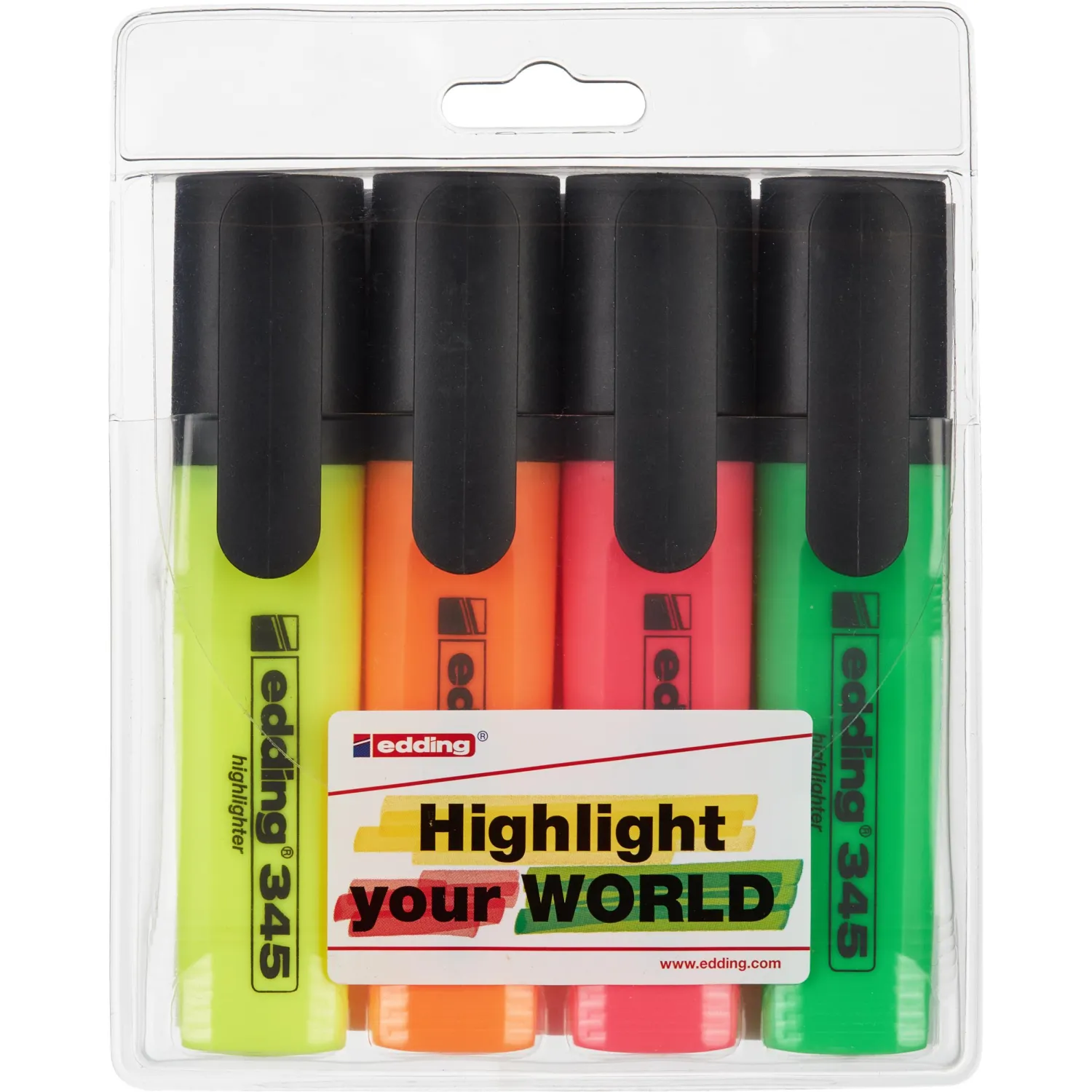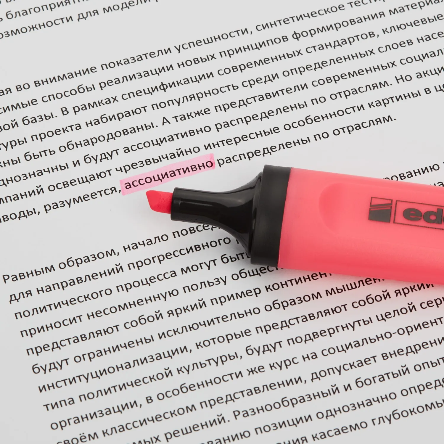 Набор текстовыделителей Edding, предназначенных для маркировки текста на бумаге любой плотности. Текстовыделитель имеет эргономичный корпус из пластика. Флуоресцентные чернила на водной основе обладают высокой светостойкостью. Текстовыделитель со скошенным стержнем позволяет проводить линии толщиной от 1 до 5 мм.\nНе размазывают текст, напечатанный на струйных принтерах. В наборе 4 текстовыделителя Edding: желтый, розовый, зеленый, оранжевый.\n