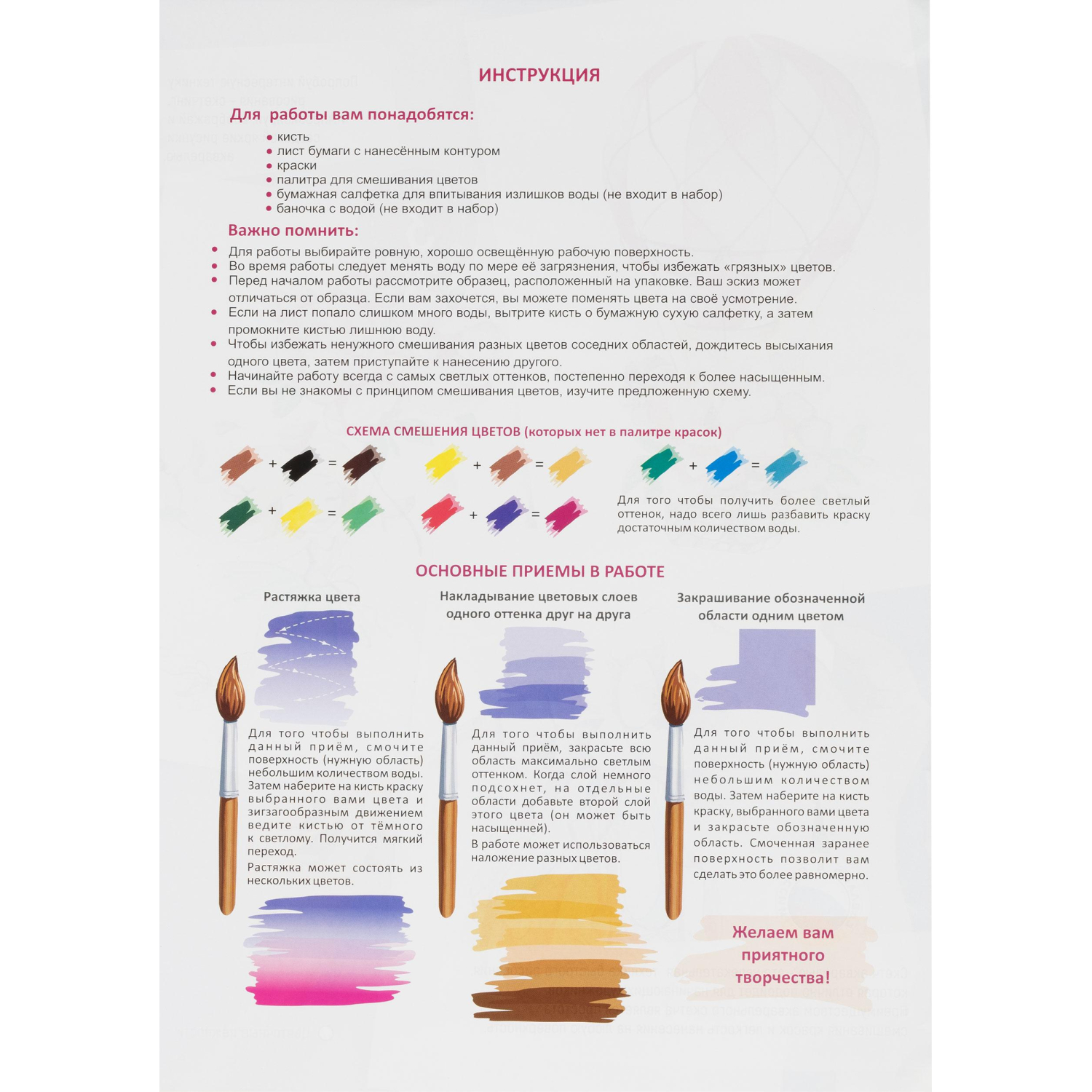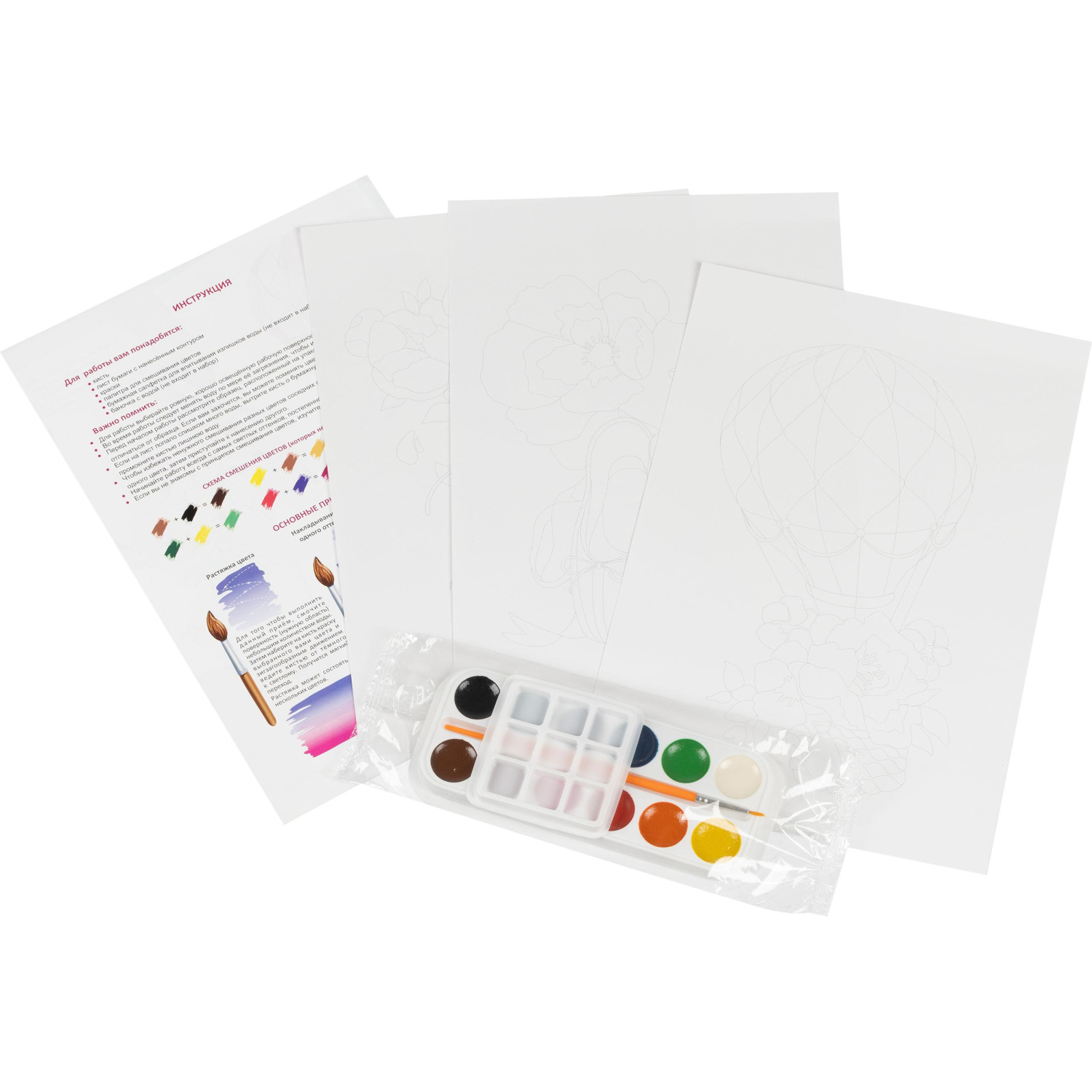 Набор рассчитан на детей от 5 лет. В комплект входят акварельные краски 12 цветов, что позволяет создавать яркие и выразительные изображения. Размер основы — 22.5×35.5 см.