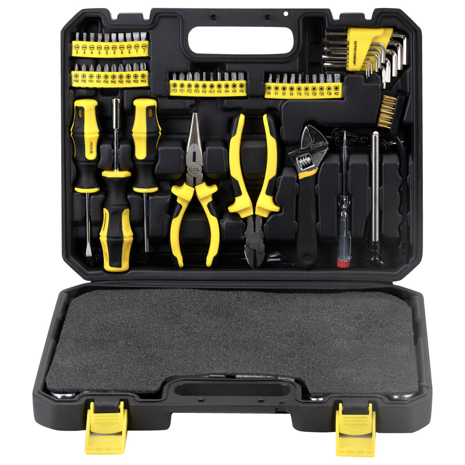 Инструменты размещены в ударопрочном кейсе с двумя застёжками и ручкой для удобной переноски. Каждый элемент прочно зафиксирован внутри и не выпадает при транспортировке. Углубления для бит и торцевых головок промаркированы по размеру, что облегчает поиск нужного инструмента.