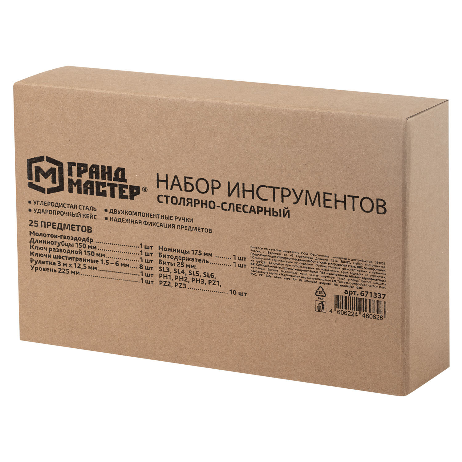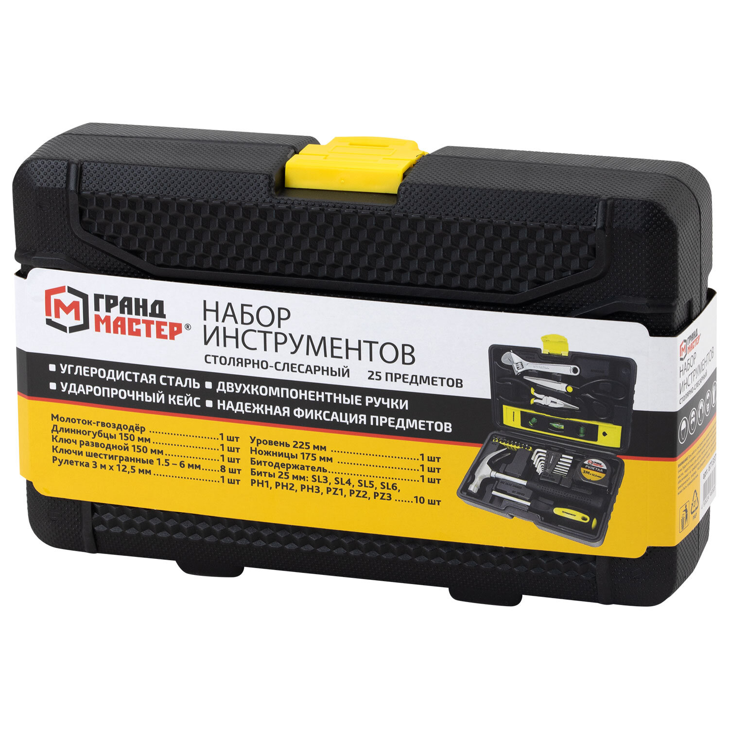 О товаре «Набор инструментов столярно-слесарный, 25 предметов, пластиковый кейс, ГРАНДМАСТЕР, 671337»