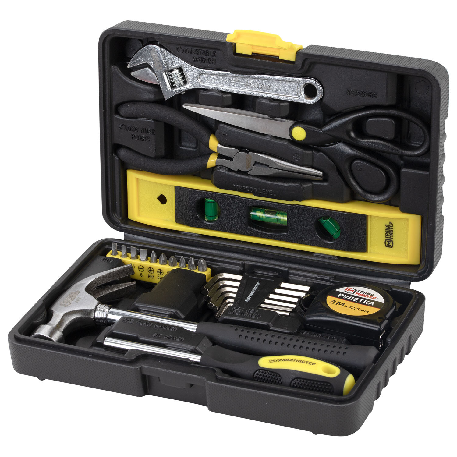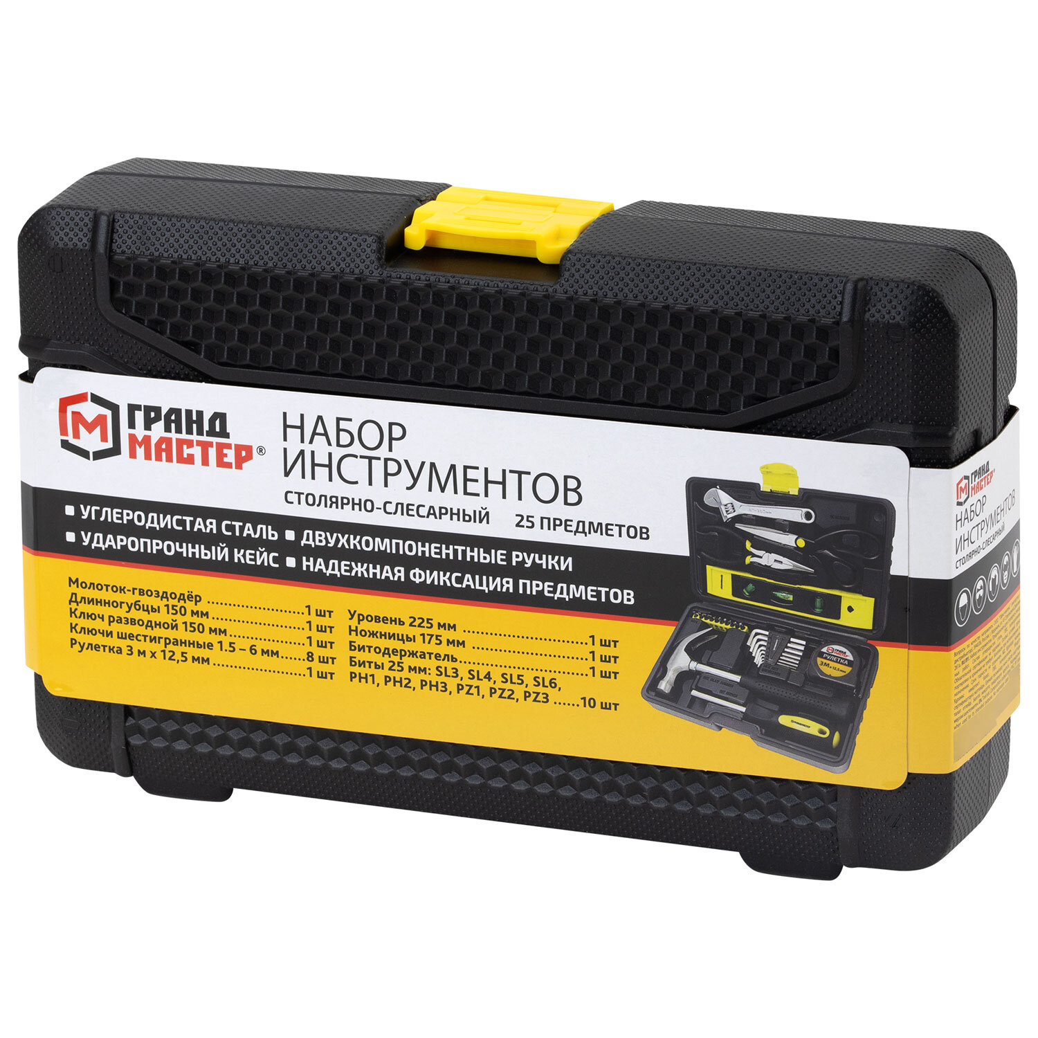 Набор инструментов столярно-слесарный, 25 предметов, пластиковый кейс, ГРАНДМАСТЕР, 671337