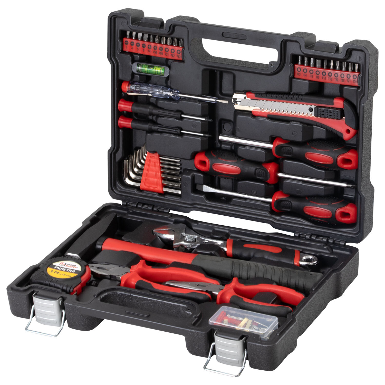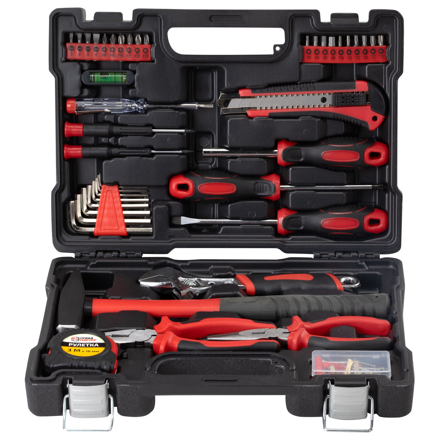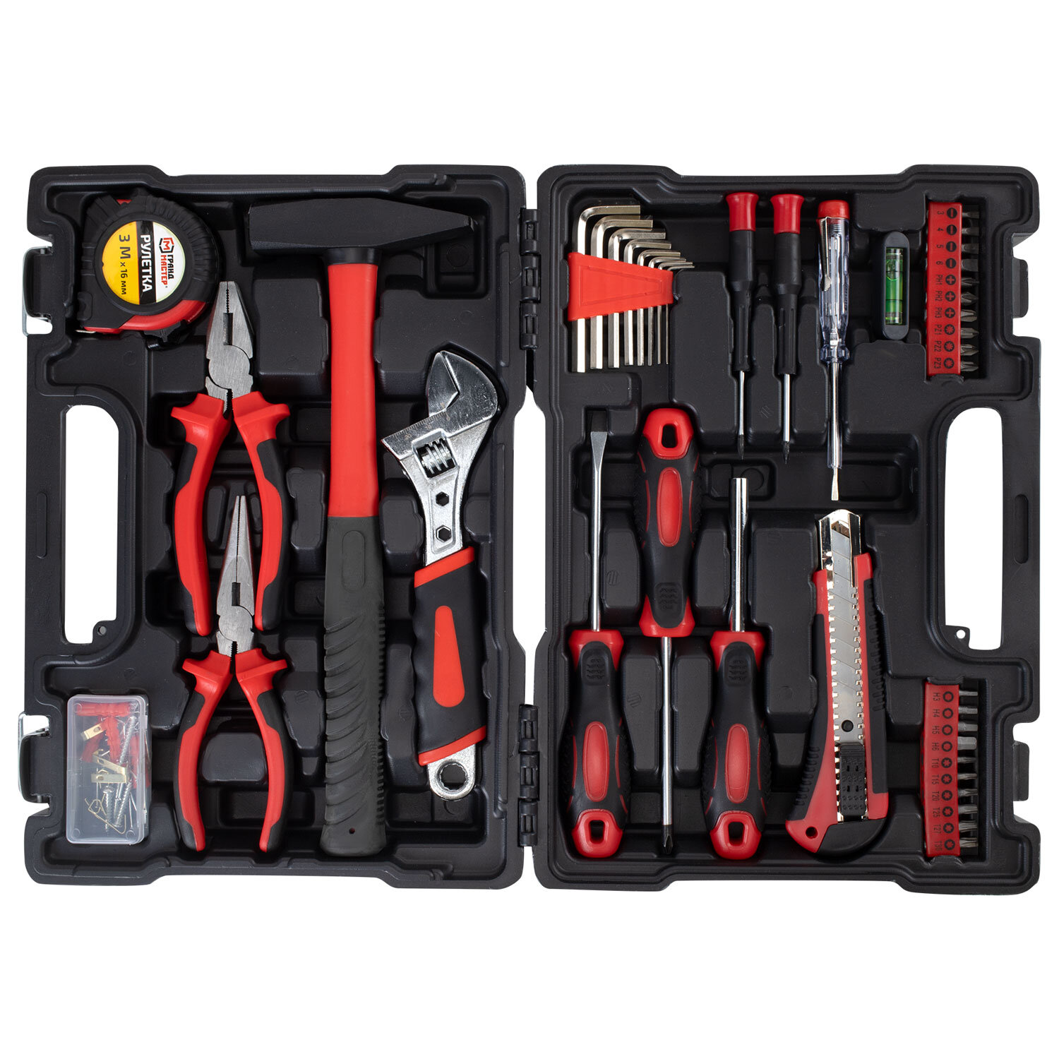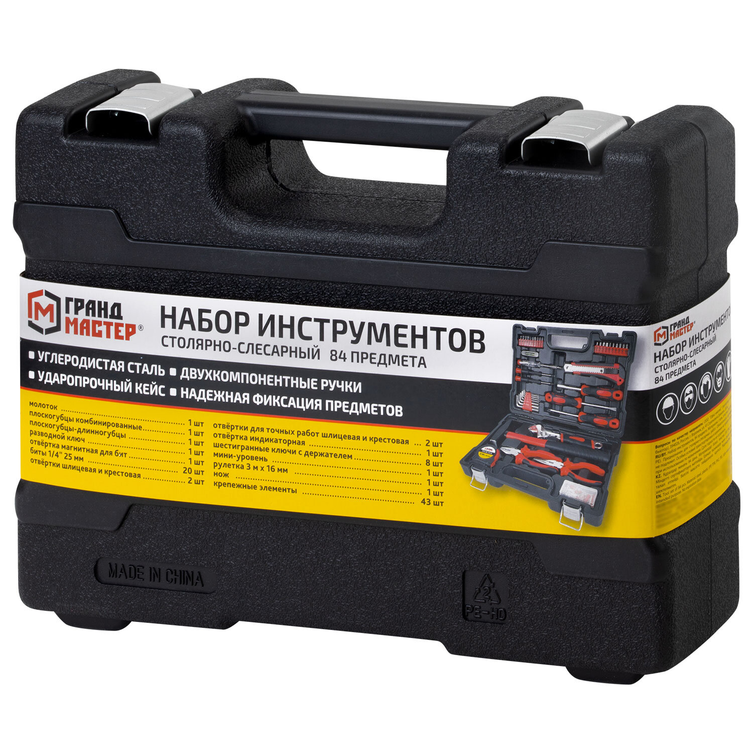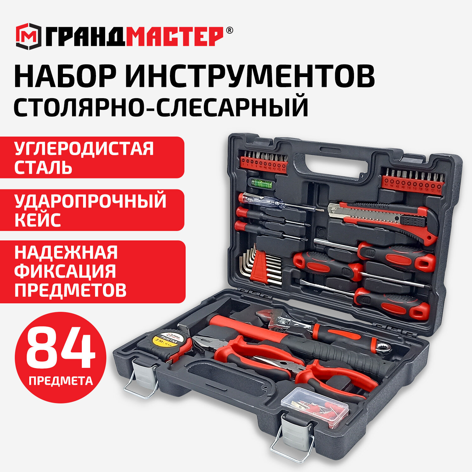 Набор инструментов столярно-слесарный, 84 предмета, пластиковый кейс, ГРАНДМАСТЕР, 671331