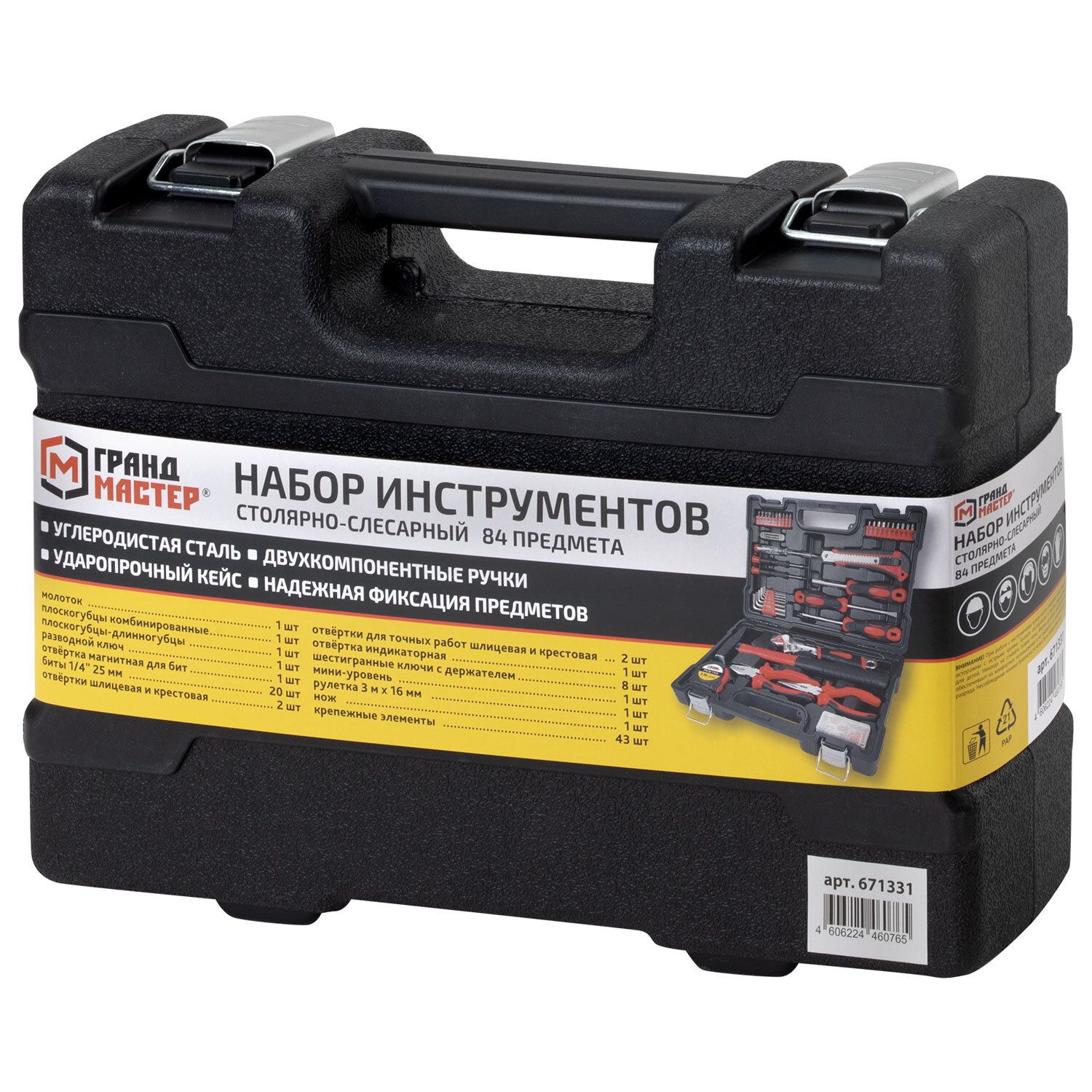 О товаре «Набор инструментов столярно-слесарный, 84 предмета, пластиковый кейс, ГРАНДМАСТЕР, 671331»
