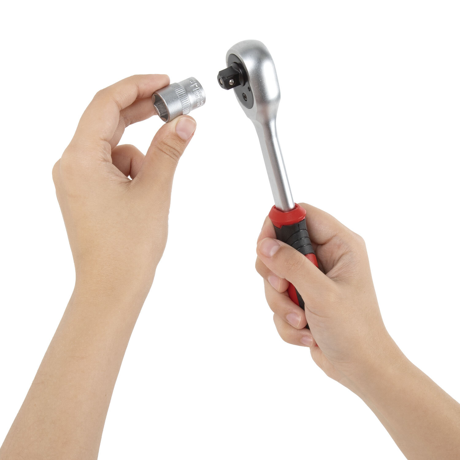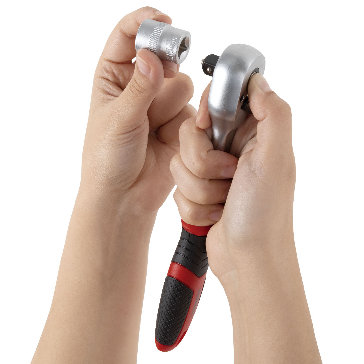 Реверсивная трещотка, удлинители и адаптер обеспечивают доступ к креплениям и узлам даже в труднодоступных местах.