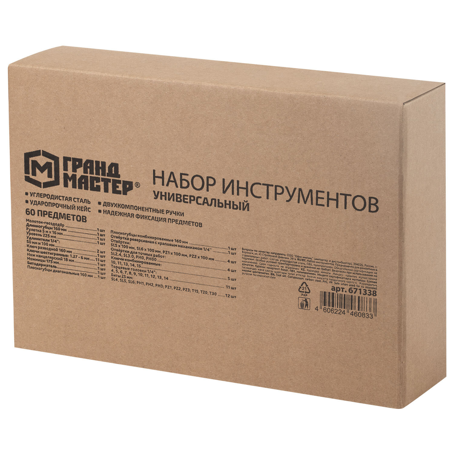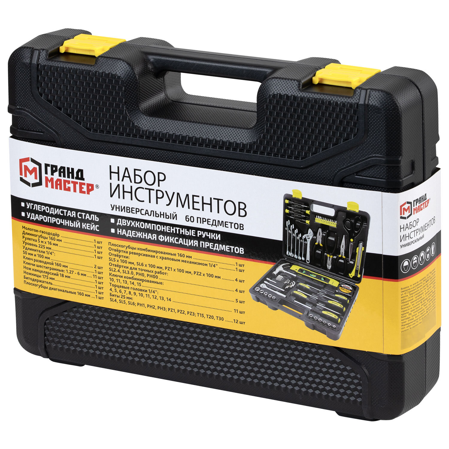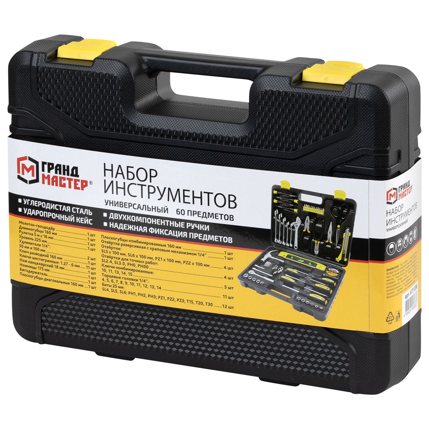 Набор инструментов универсальный, 60 предметов, пластиковый кейс, ГРАНДМАСТЕР, 671338