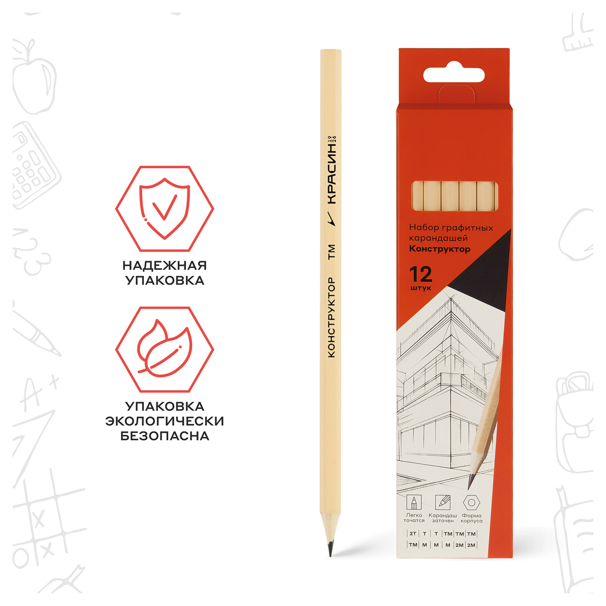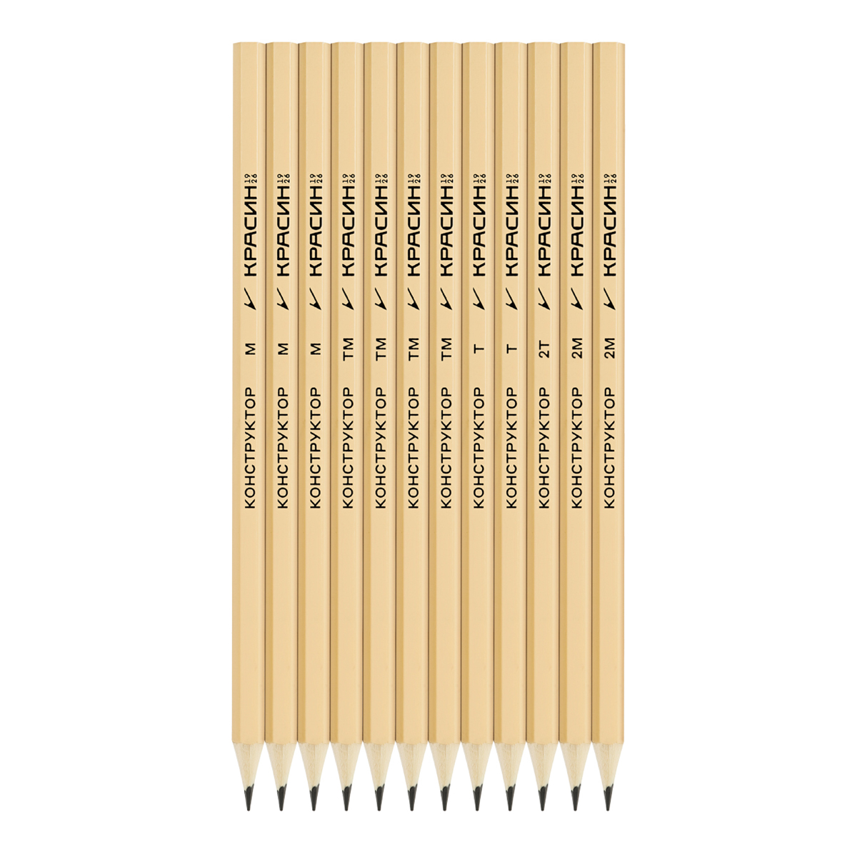 Набор карандашей ч/г Красин "Конструктор" 12шт., 2Т (2H), Т(H)-2, ТМ (HB)-4, М (B)-3, 2М (2B)-2, шестигран., заточен., карт. упаковка., европодвес