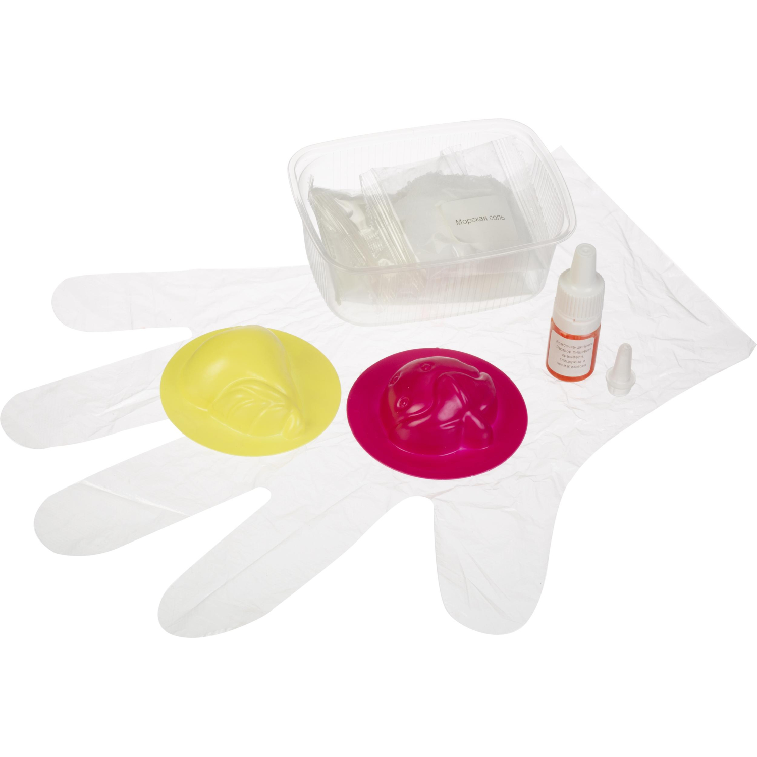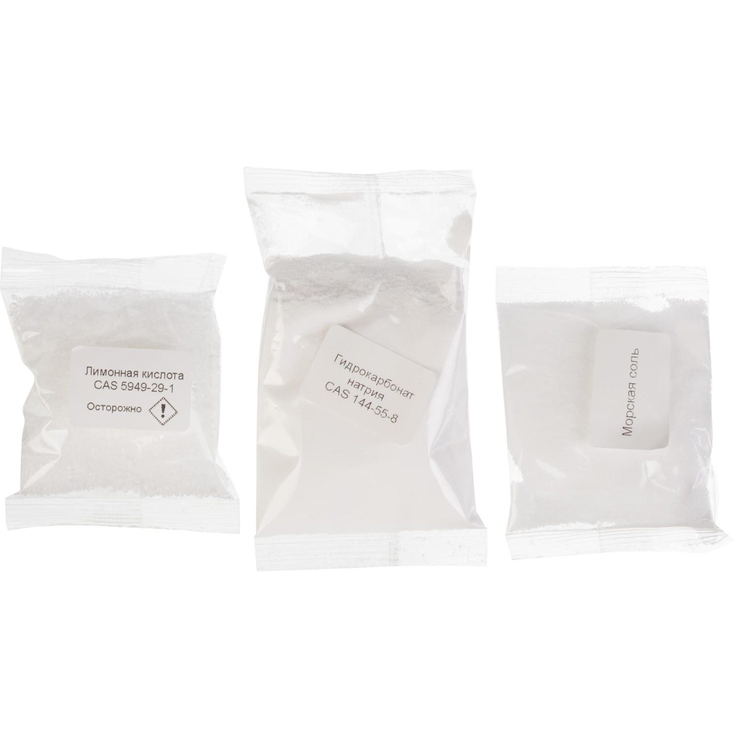 Комплектация: сода пищевая, лимонная кислота, морская соль, раствор пищевого красителя, ароматизатора и глицерина, формочки, ёмкость для смешивания, дозатор для флакона, перчатки, инструкция.