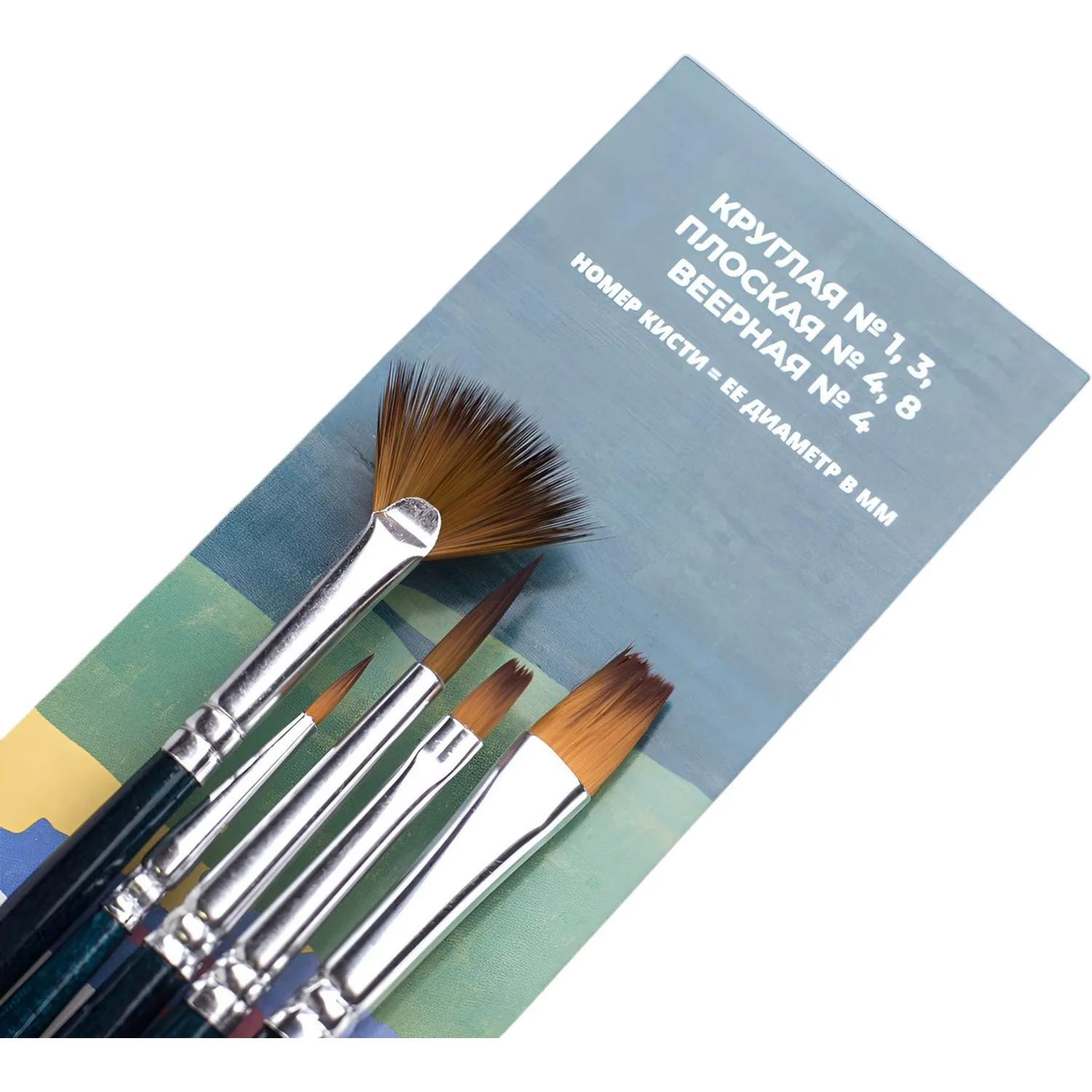 В наборе: круглые кисти №1, 3, плоские №4, 8, веерная №4.