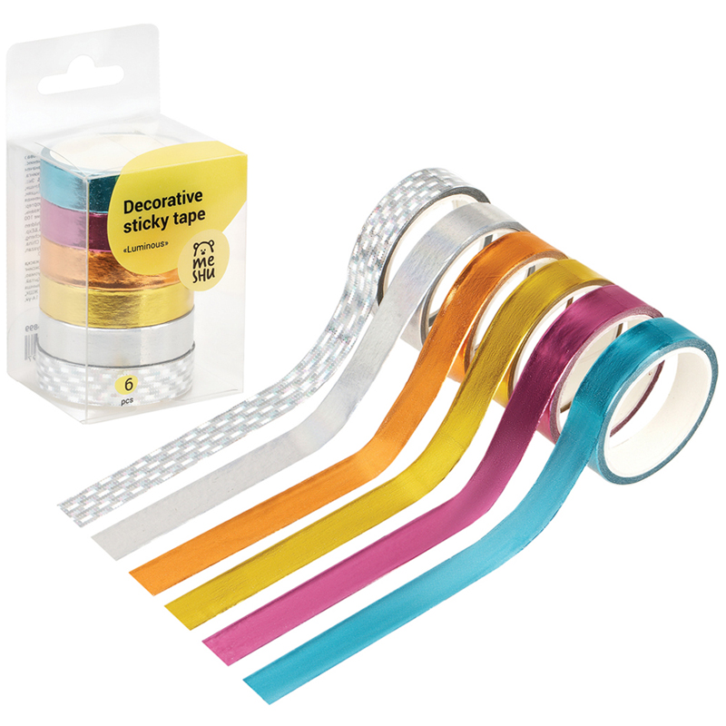 Клейкая лента канцелярская Meshu Luminous декоративная 15 мм х 3 м (6 штук в упаковке)