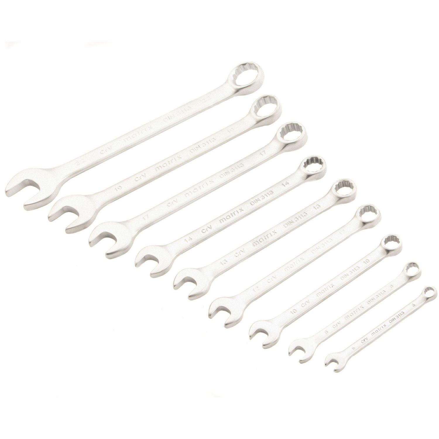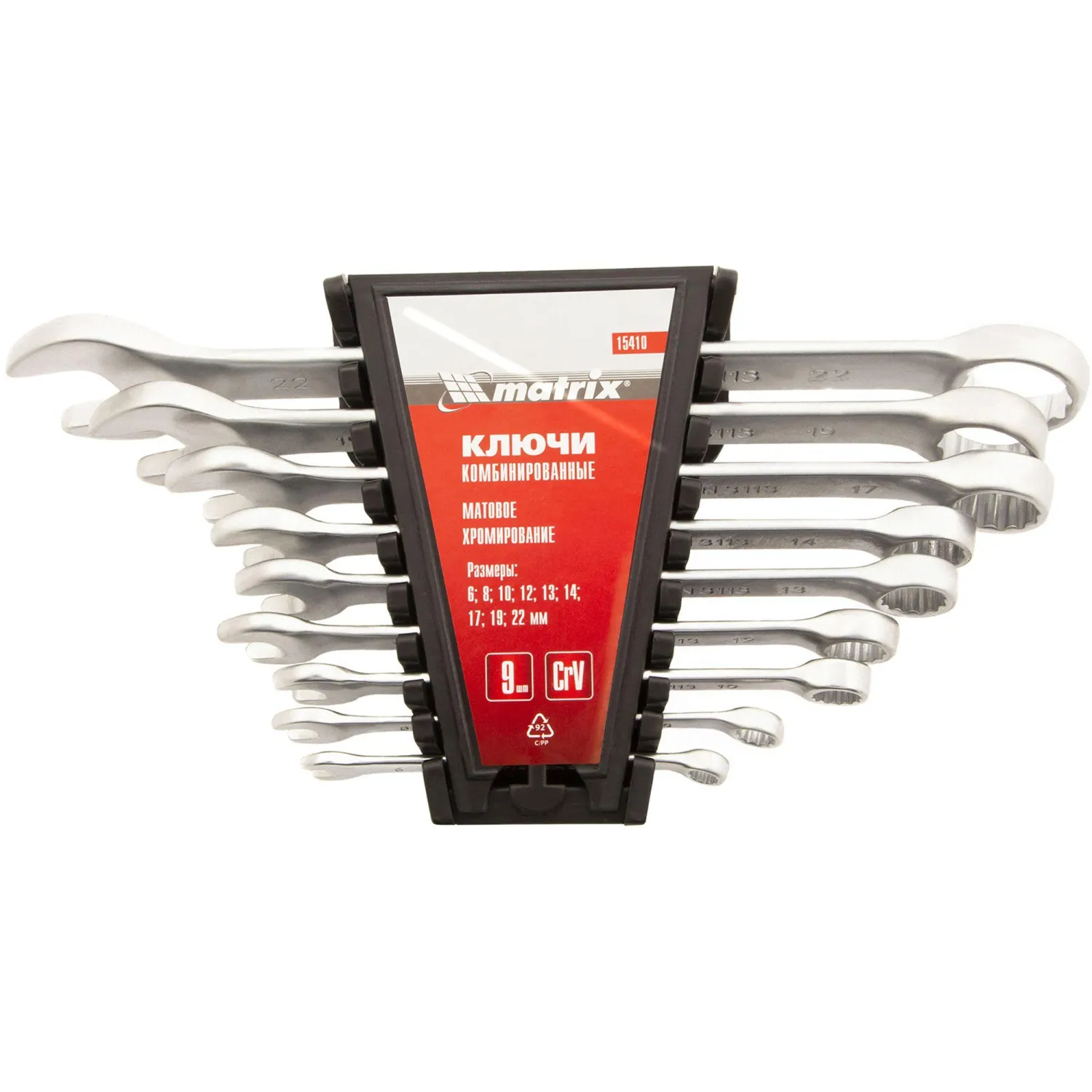 Набор ключей комбинированных MATRIX, 6 — 22 мм, 9 шт, CrV, матовый хром. Ключи изготовлены из хром-ванадиевой стали. Твердость материала рабочей части ключа 45 HRc (требования ГОСТ — 45–51 HRc). Ключи имеют матовое хромоникелевое покрытие. Профиль кольцевого зева имеет 12 граней, что увеличивает площадь соприкосновения рабочих поверхностей и снижает риск деформации граней крепежа при монтаже. Угол наклона кольцевого зева относительно плоскости ключа в 15 градусов делает монтаж более удобным. Поставляются в комплекте с трапециевидным пластмассовым держателем. Набор предназначен для монтажа демонтажа резьбовых соединений.Страна-производитель: Индия
