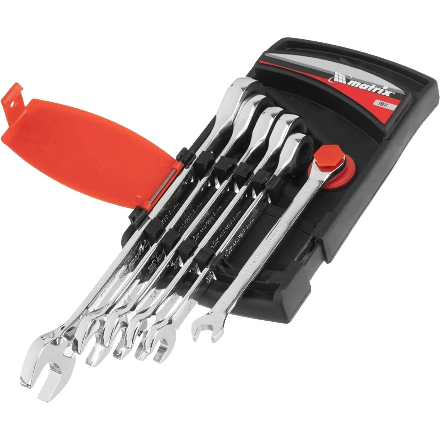 Набор ключей представляет собой комплект комбинированных инструментов Matrix 14511, предназначенных для работы с резьбовыми соединениями, включая труднодоступные зоны. В набор входят шесть трещоточных шарнирных ключей размером от 8 до 17 мм.