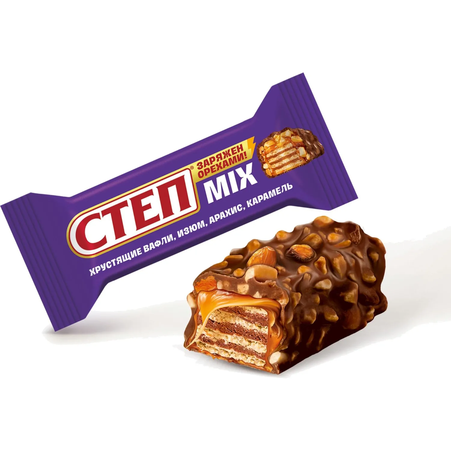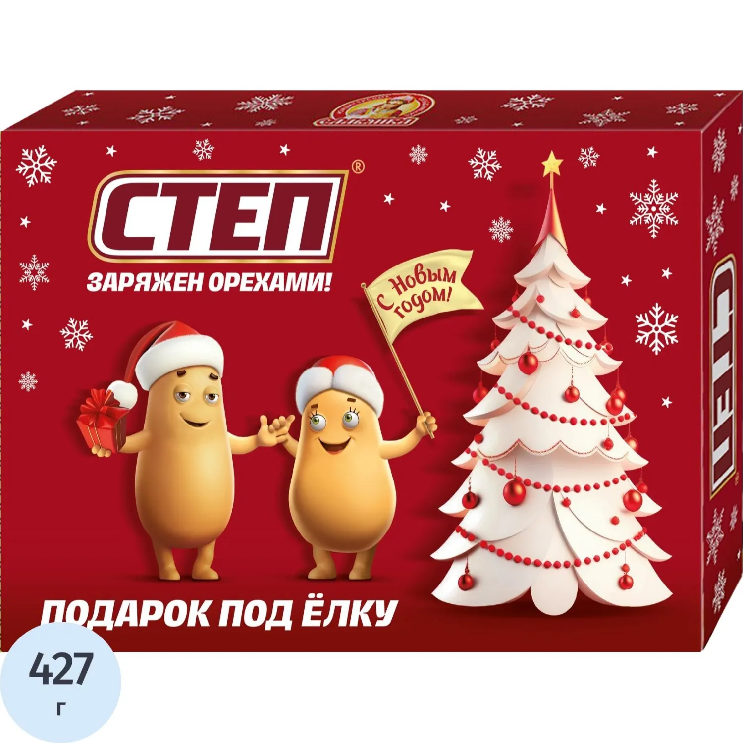 Состав подарка: конфеты: Золотой степ 1 шт, Степ MIX 2 шт, Степ лесной орех с арахисом и фундуком 1 шт, Super Step 1 шт, Степ MIX 40 г 1 шт, Super Step шоколадная нуга и лесной орех с арахисом и фундуком 1 шт. Батончик: Степ Extra Nut 47 г 1 шт, Super Step нуга, арахис и карамель 65 г 1 шт, Драже Степ арахис 45 г 1 шт. Плитка Степ с начинкой арахис и карамель 80 г 1 шт.