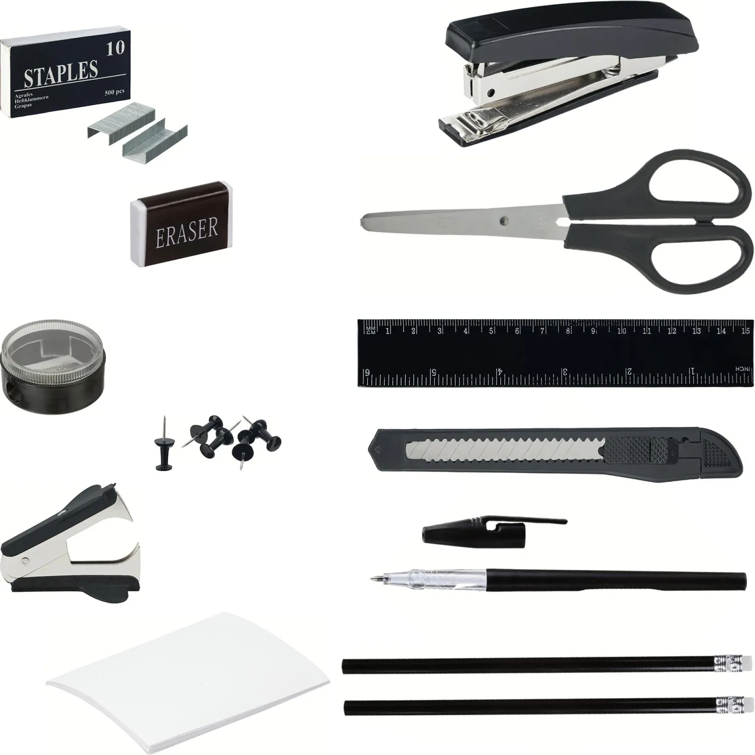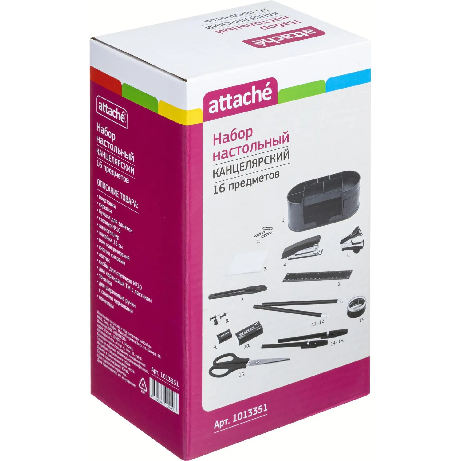 подставка, степлер № 10, нож канцелярский, точилка, кнопки силовые, линейка 15 см, два карандаша ТМ с ластиком, ластик, скобы для степлера № 10, две шариковые ручки с синими чернилами, антистеплер, бумага для заметок, скрепки, ножницы. Всего 16 предметов. Поставляется в картонной коробке.