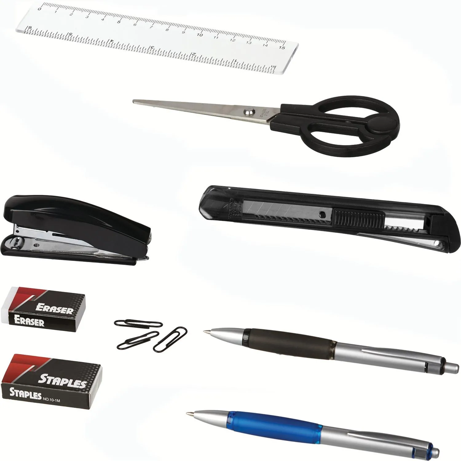 подставка, ножницы, линейка, степлер, скобы, нож, ластик, скрепки, механический карандаш, автоматическая шариковая ручка. Всего 10 предметов. Поставляется в картонной коробке.