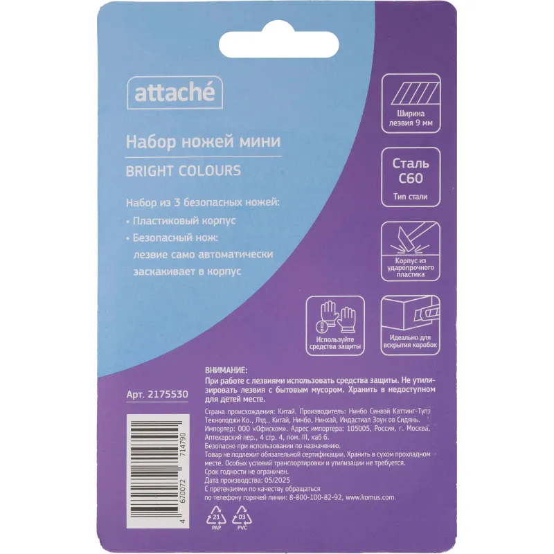 Любые вопросы по товару «Набор ножей универсальных безопасных мини Attache 9 мм (3 штуки в упаковке, SX18-8X3)» вы можете задать нашим продавцам по телефонам +7 (495) 215-28-10, 8 (800) 555-3604, электронной почте info@ofsi.ru и в скайпе ofsi.ru.