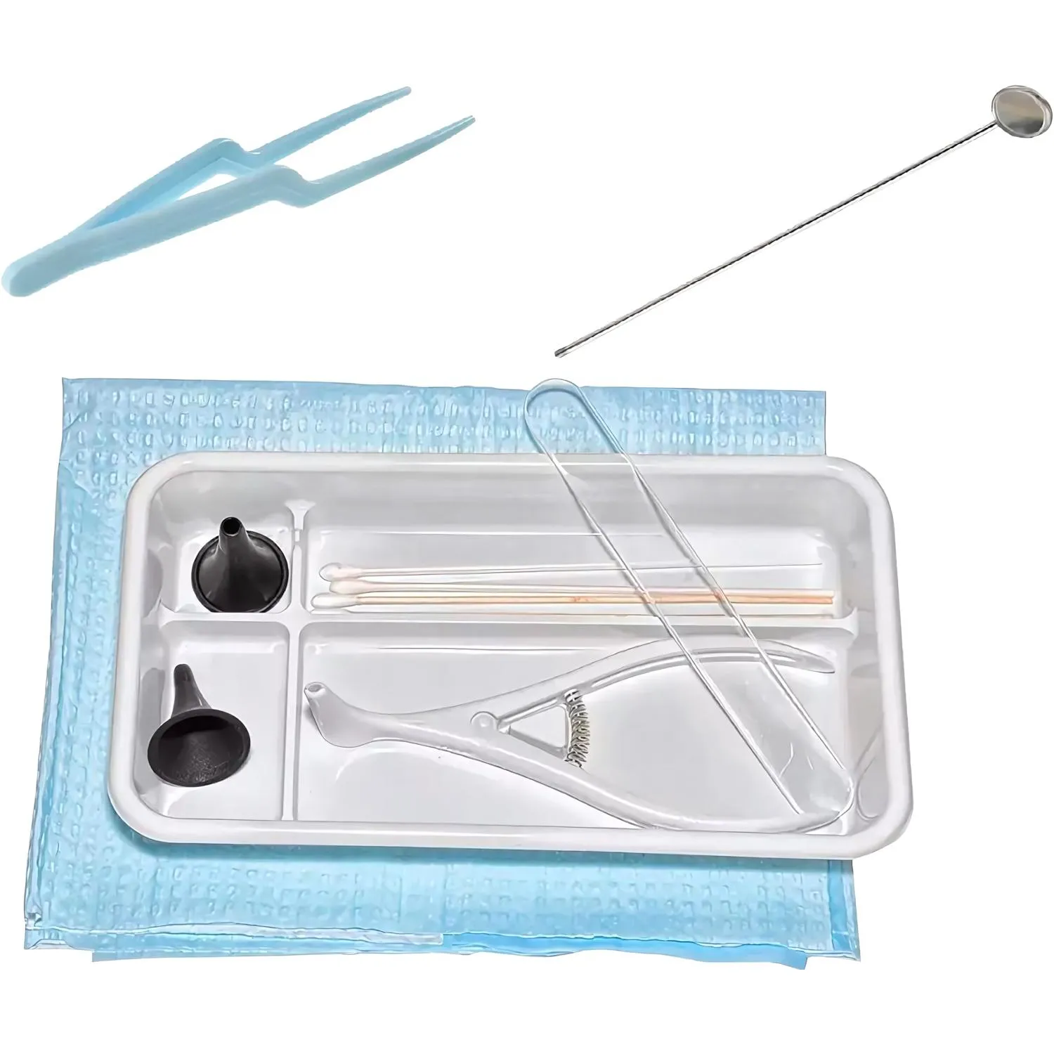 Состав набора: зеркало носовое, зеркало гортанное, шпатель для языка, воронки ушные №1, №3, пинцет, перчатки, салфетка, лоток полимерный.