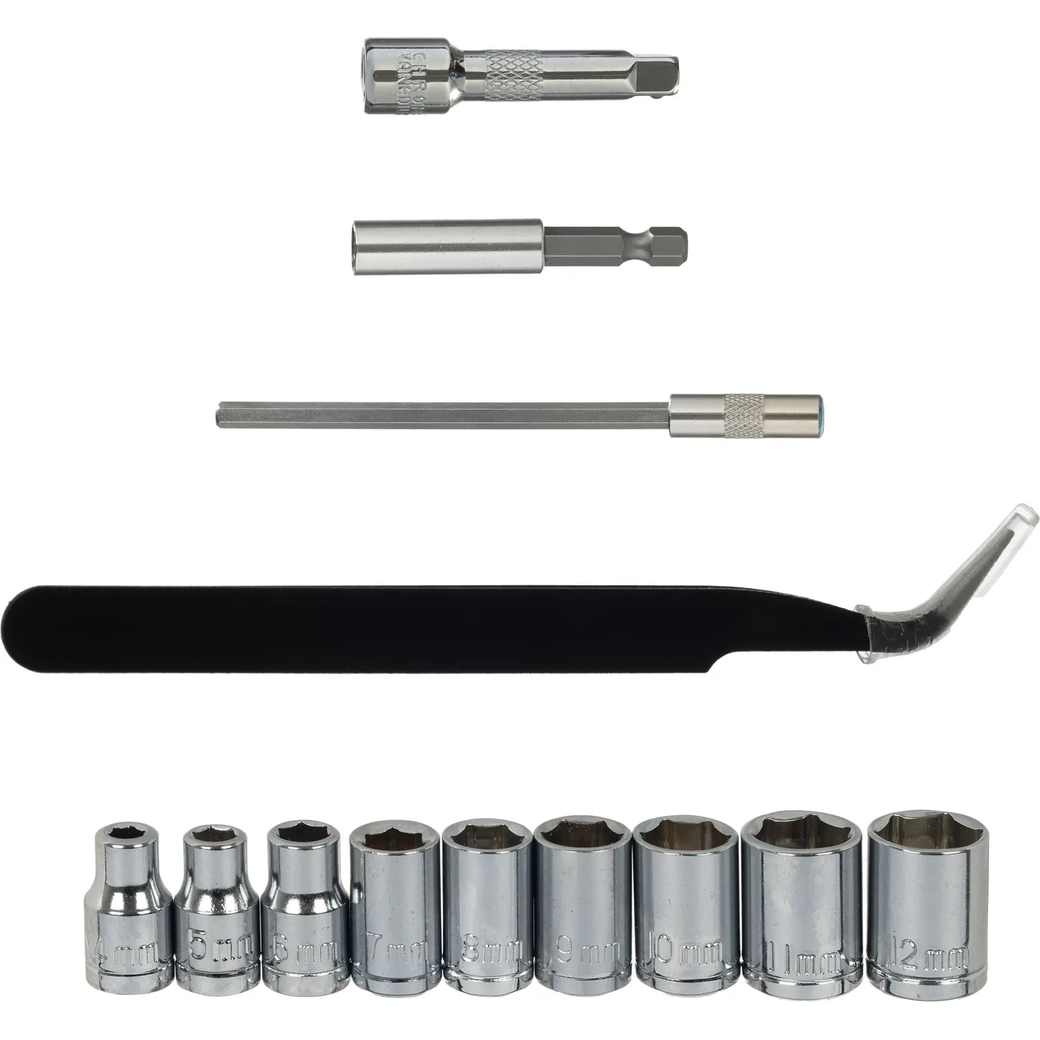 — Головки из углеродистой стали: 4 мм, 5 мм, 6 мм, 7 мм, 8 мм, 9 мм, 10 мм, 11 мм, 12 мм (9 шт)
