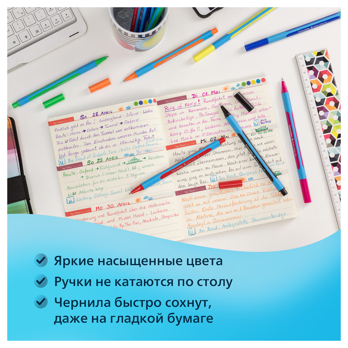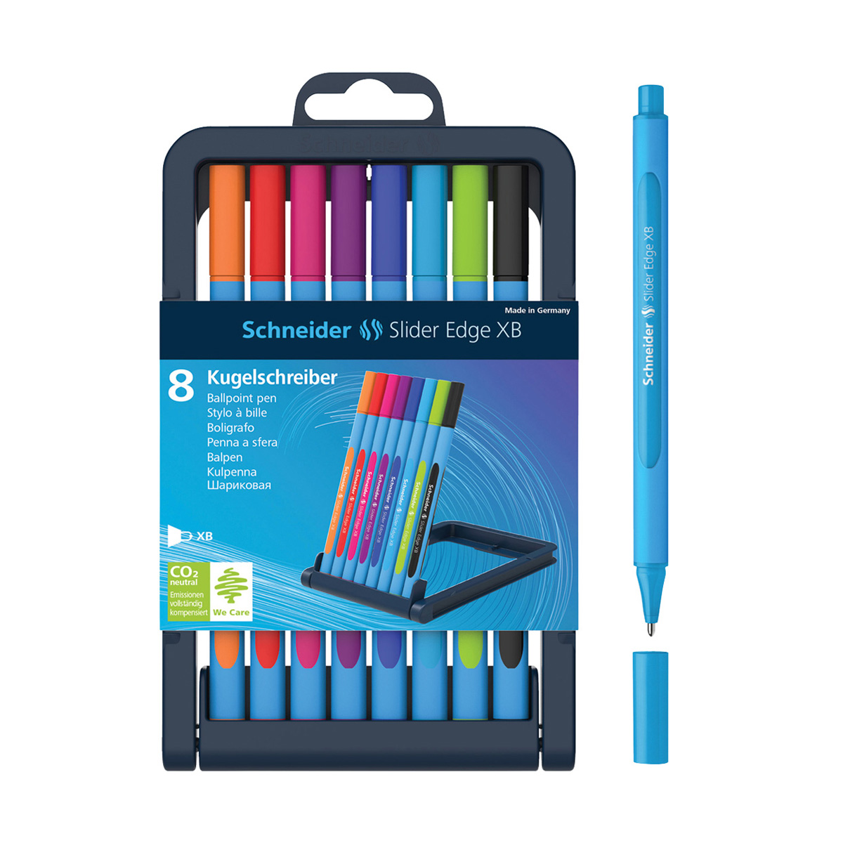 Набор шариковых ручек Schneider Slider Edge в ярком дизайне. Диаметр пишущего узла ручки составляет 1,4 мм, толщина линии письма – 0,7 мм. Эргономичные шариковые ручки в трехгранном прорезиненном корпусе изготовлены с использованием запатентованной технологии Viscoglide® для необычайно легкого и скользящего письма. 8 ярких цветов: оранжевый, красный, розовый, фиолетовый, синий, светло-синий, светло-зеленый, черный. Упакованы в пластиковый раскладывающийся футляр-подставку с европодвесом. Письменные принадлежности Schneider разрабатываются и производятся только в Германии.