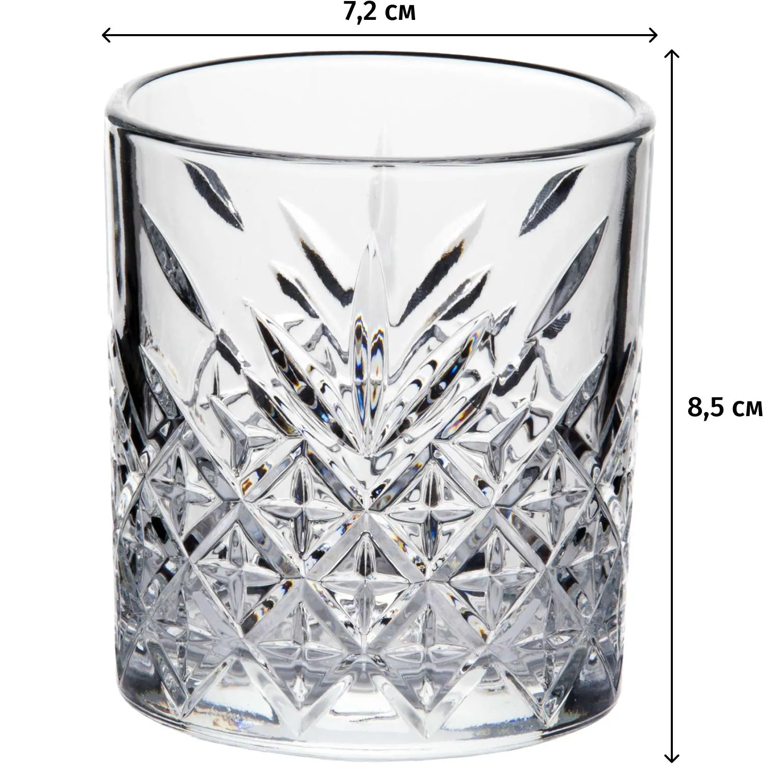 Объём каждого стакана составляет 345 мл, высота — 8.5 см, диаметр — 7.2 см. Элегантная гравировка придаёт посуде изысканный вид и делает её оригинальным элементом стола.