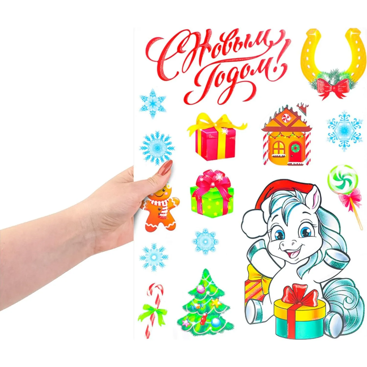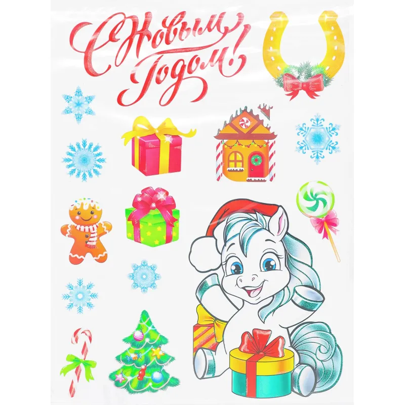 Наклейка новогодняя на окна и стены с изображением лошадки предназначена для праздничного оформления интерьера. Она украшена надписью «С Новым годом!» и дополнена снежинками, ёлочкой, подарками, пряничным человечком, леденцом и домиком, что помогает создать атмосферу зимнего праздника.