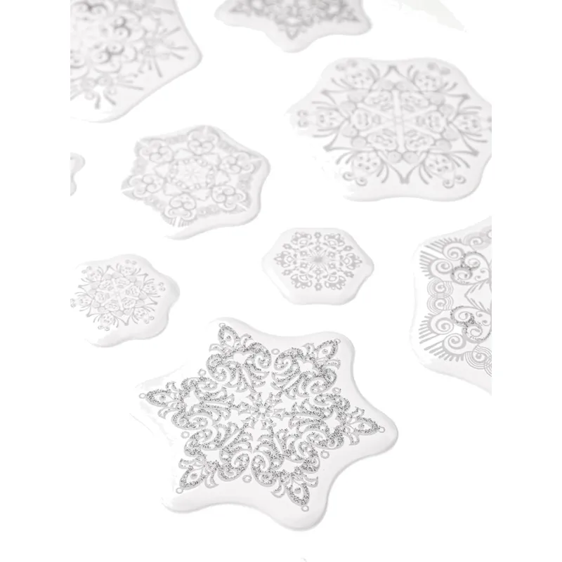 Элементы изготовлены из бумаги и ПВХ с объёмной поверхностью. Цветовое оформление серебристое. Клейкая основа надёжно фиксирует украшение и легко снимается, не оставляя следов. Лист размером 25×14.4 см содержит 12 наклеек. Изделие можно применять многократно, однако использовать только внутри помещений.