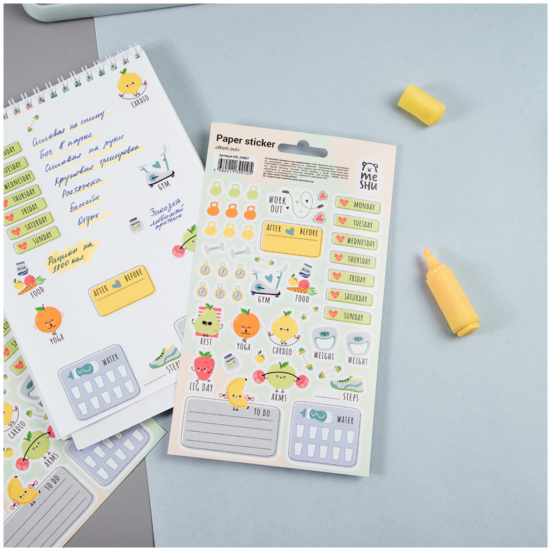 Наклейки бумажные для ежедневников MESHU "Work out", 12*21см, 45 наклеек, европодвес