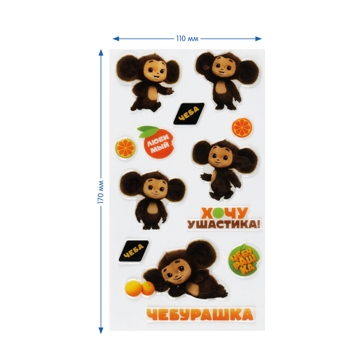Гелевые наклейки «Мульти-Пульти» серии «Чеба» предназначены для декорирования поверхностей, а также для игр, оформления рисунков и открыток. Размер листа — 110*220 мм. В набор входят 12 наклеек, пять из которых с изображением любимого героя детей и взрослых — Чебурашкой.