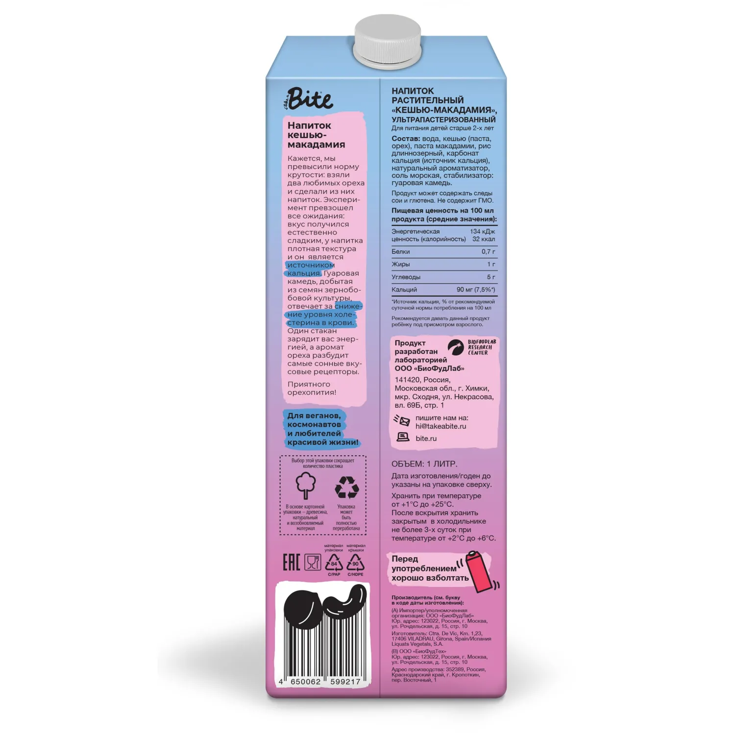 О товаре «Напиток растительный Bite кешью-Макадамия, ультрапаст. 1л»