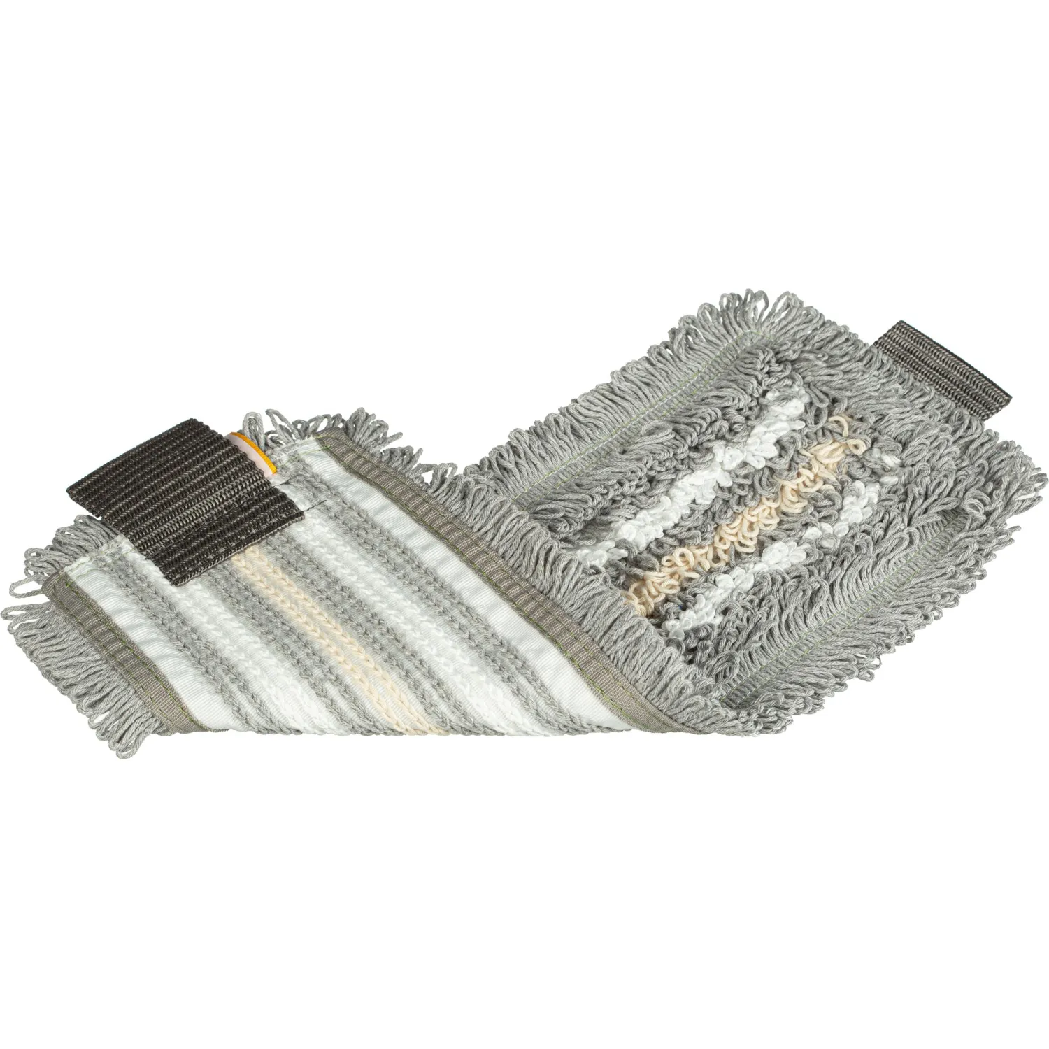 Насадка МОП из микрофибры и хлопка предназначена для влажной уборки твёрдых напольных покрытий. Она имеет прямоугольную форму размером 40×15 см и крепление на ремнях, что позволяет использовать её с держателем и системой УльтраСпид Про. Комбинированная структура нитей обеспечивает универсальное действие: белые микроволокна эффективно отмывают, серые комбинированные нити помогают оттирать и удерживать грязь, а бежевые хлопковые волокна впитывают влагу и собирают крупные загрязнения. Петельчатая конструкция облегчает скольжение по полу и удерживает мусор внутри петель, а плотная основа с двойной прошивкой увеличивает срок службы изделия.