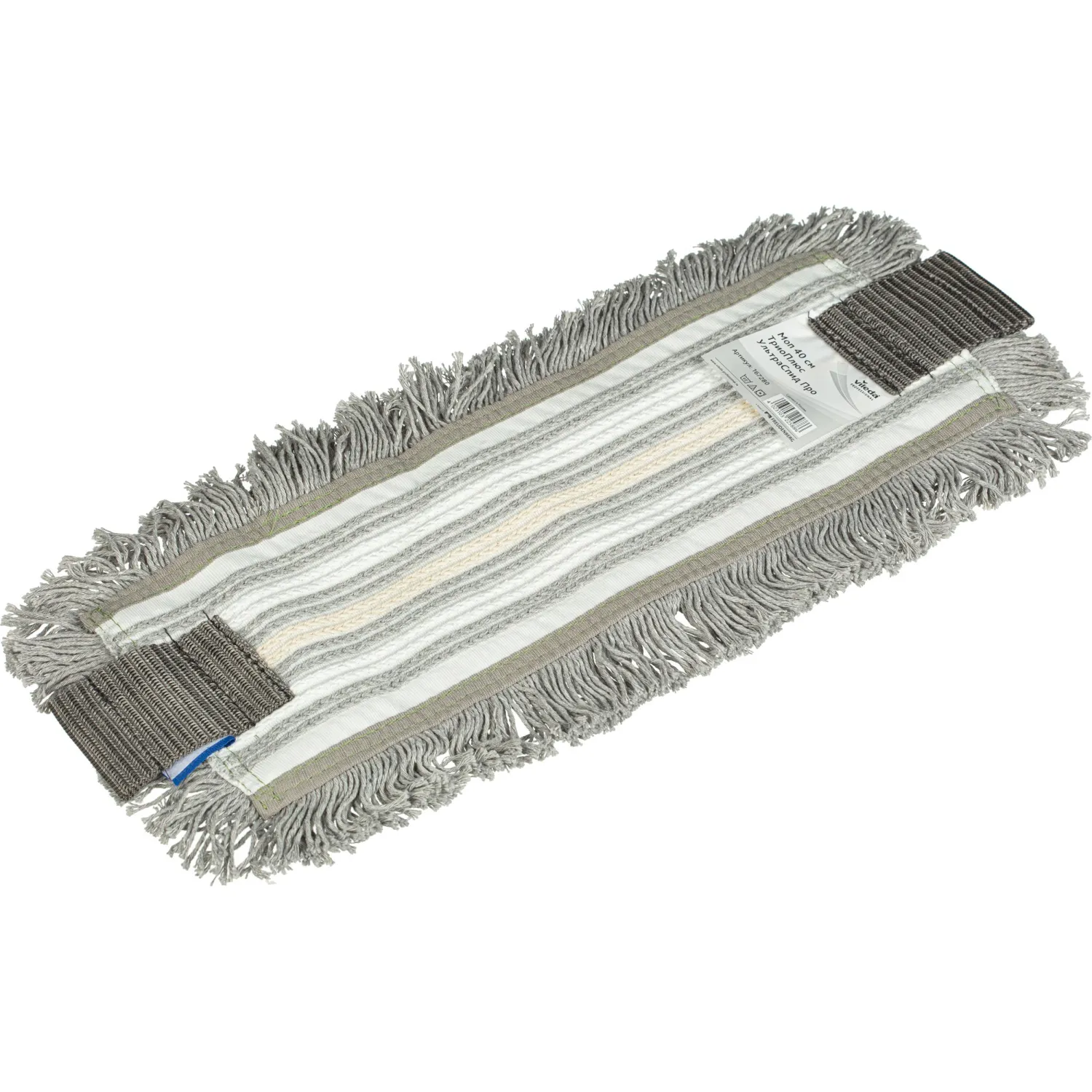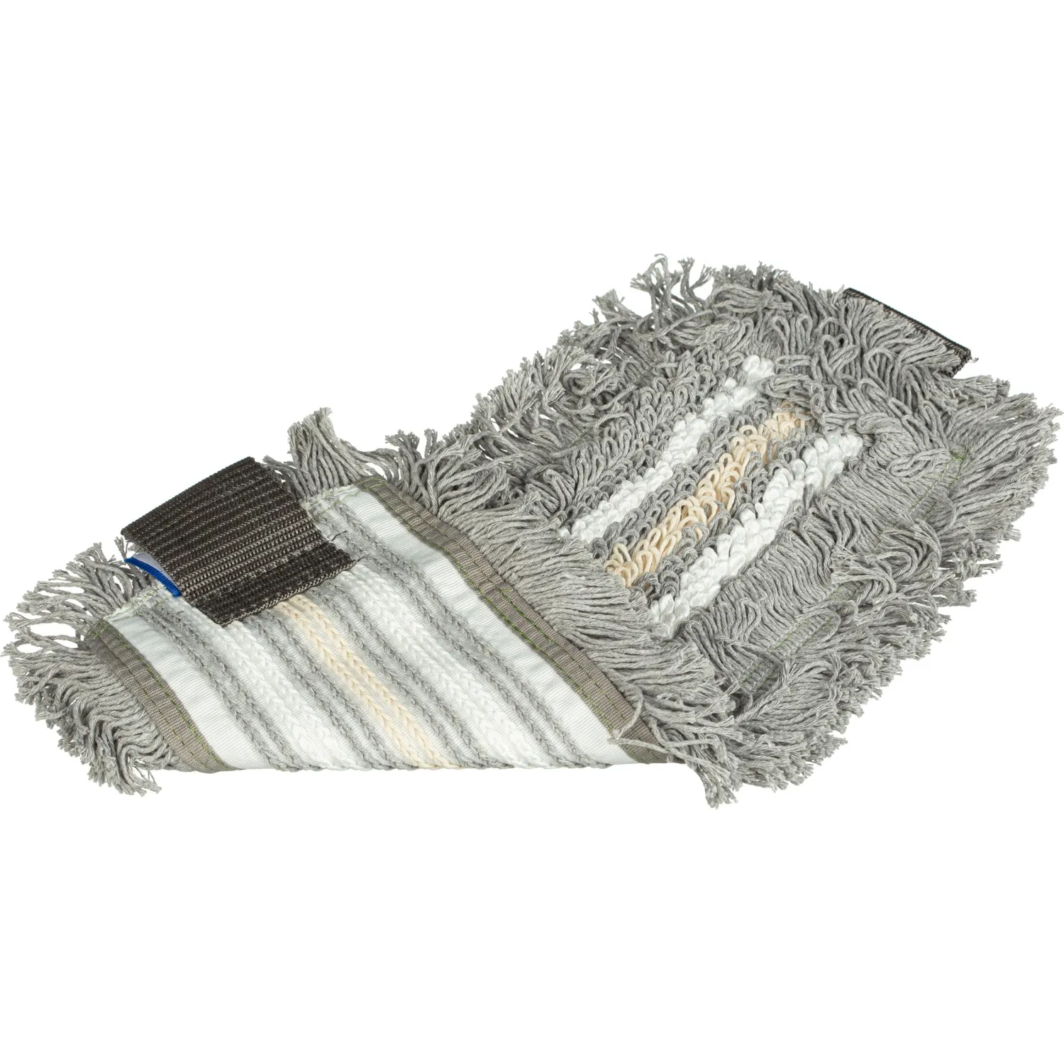 Насадка МОП из микрофибры и хлопка предназначена для интенсивной влажной уборки твёрдых напольных покрытий. Прямоугольная форма размером 40×15 см и крепление на ремнях обеспечивают совместимость с системой УльтраСпид Про. Комбинированная структура нитей делает МОП универсальным: белые микроволокна эффективно отмывают загрязнения, серые нити помогают оттирать и удерживать грязь, а бежевые хлопковые волокна впитывают влагу и собирают мусор. За счёт дополнительного объёма и плотности бахромы МОП хорошо справляется с уборкой пыли и влаги в осенне-зимний период, а также подходит для послестроительной уборки. Петельчатая конструкция облегчает скольжение по полу, удерживает загрязнения и разрушает их структуру трением, повышая эффективность очистки.