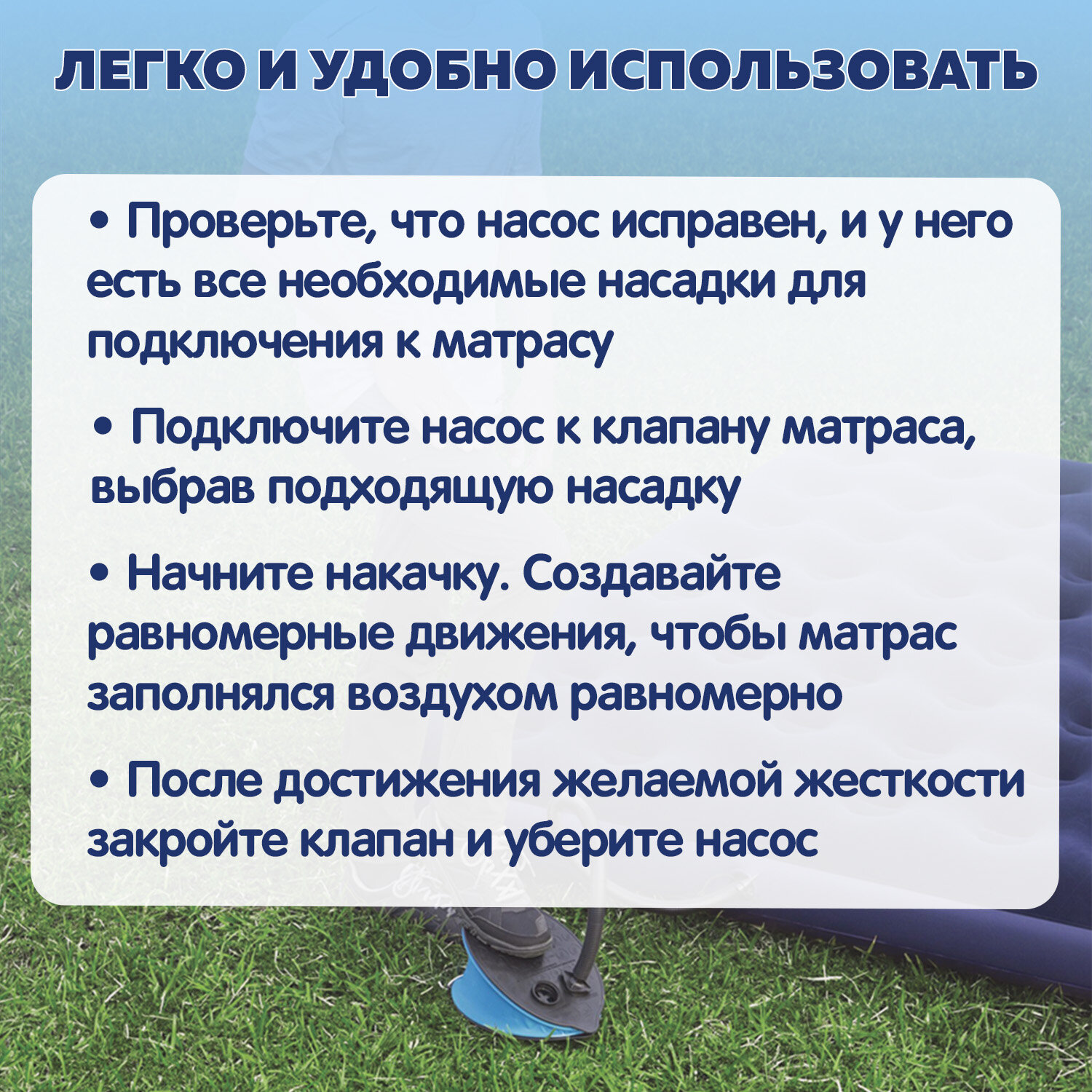 Насос прост в использовании. Легко переключается с надувания на сдувание. У насоса гибкий шланг. 3 насадки подходят практически для любого клапана.