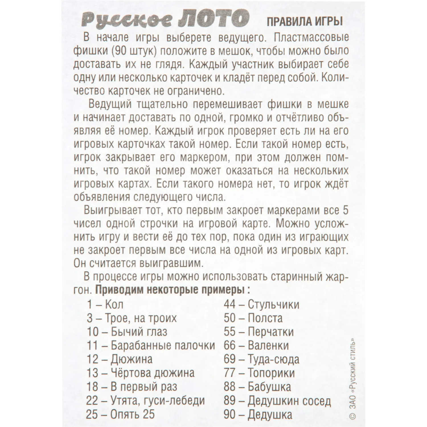 Настольная игра «Лото» ТМ «Русский стиль» — это классическая игра, которая пользуется популярностью у детей и взрослых. В набор входит 24 игровые карточки, пластмассовые фишки с номерами от 1 до 90, картонные жетоны и правила игры. В ходе игры ведущий называет номер фишки, а игроки отмечают соответствующие числа на своих карточках. Побеждает тот, кто первым закроет все числа на своей карточке.