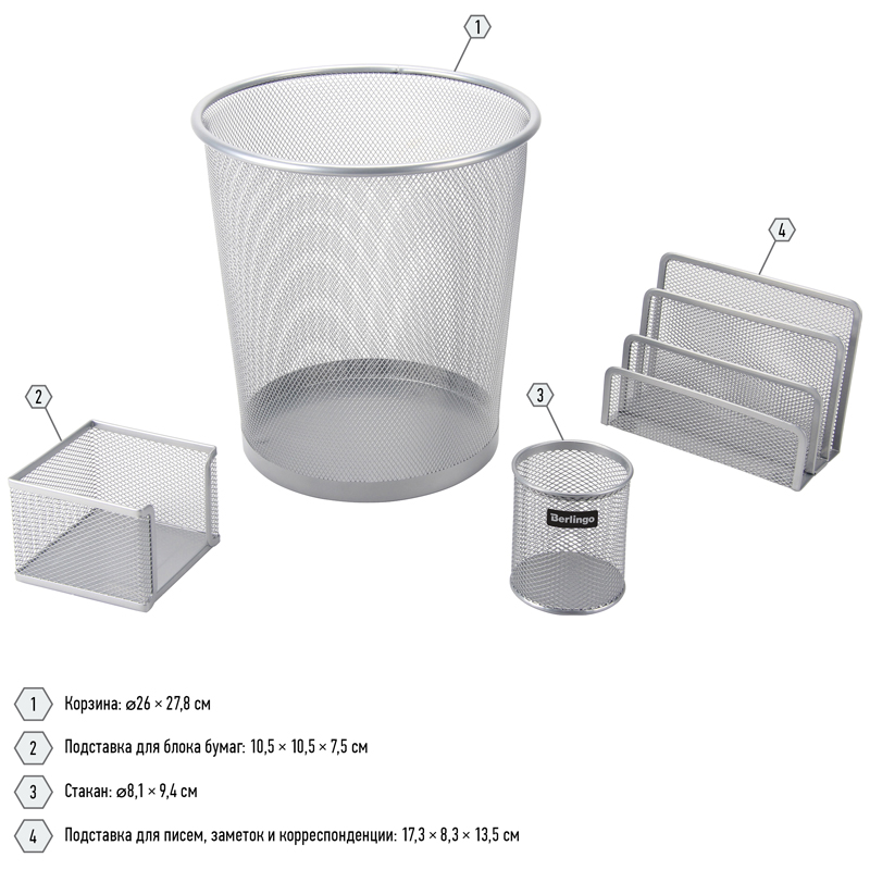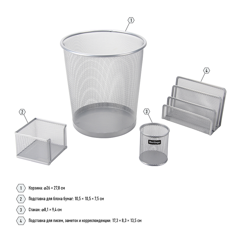 В набор входят: подставка-органайзер для пишущих принадлежностей (диаметр – 8,1*9,4 см), 3-х секционная подставка для бумаг и писем (17,3*8,3*13,5 см), подставка для бумажного блока (10,5*10,5*7,5 см), корзина для бумаг (объем – 14 литров).