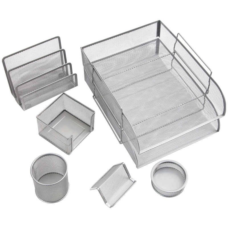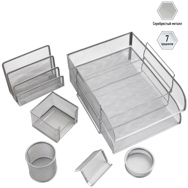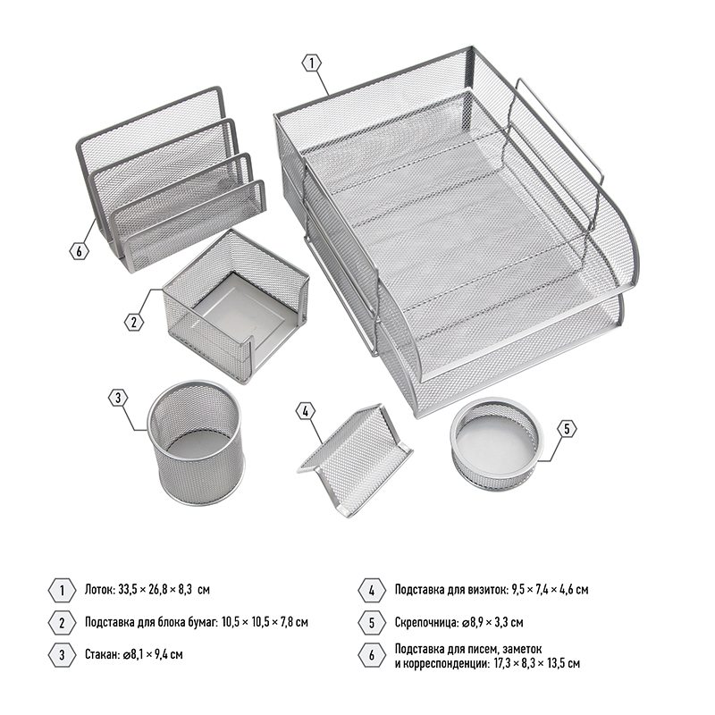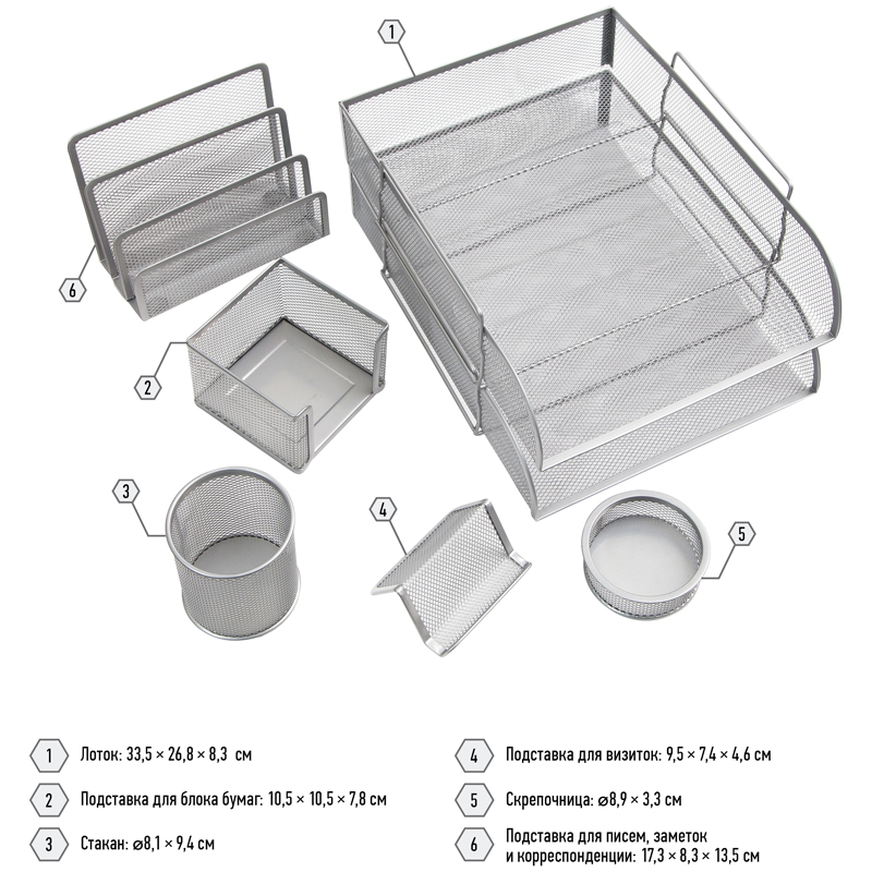В набор входят: 2 поддона для бумаг (33,5*26,8*8,3 см), 3-х секционная подставка для писем и корреспонденции (17,3*8,3*13,5 см), подставка для бумажного блока (10,5*10,5*7,8 см), подставка-органайзер для канцелярских мелочей (диаметр – 8,9*3,3 см), подставка-органайзер для пишущих принадлежностей (диаметр – 8,1*9,4 см), подставка для визиток (9,5*7,4*4,6 см).