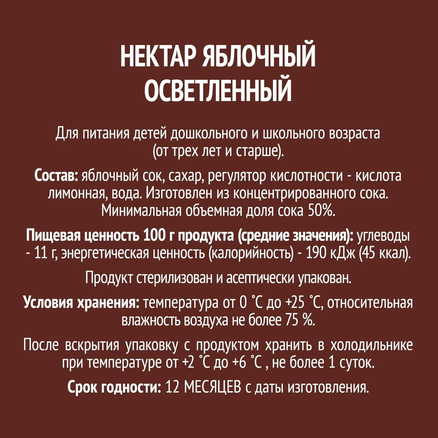 Нектар яблочный осветлённый Дары Кубани — натуральный продукт для здорового питания взрослых и детей старше 3 лет. Без консервантов и других искусственных добавок. Изготовлен из натурального яблочного сока. Для производства используются отборные и спелые зелёные яблоки, выращенных во фруктовых садах Краснодарского края. Кубань — самый южный регион России. Яркое солнце, плодородная земля, ласковые ветры и тёплые летние дожди создают самый благоприятный климат для роста и созревания яблок и других фруктов. Производство соковой продукции строго контролируется на всех этапах — от сбора урожая до розлива в упаковку, поэтому продукт имеет высокий стандарт по вкусу и качеству. В соках и нектарах содержатся полезные витамины и минеральные вещества, которые положительно влияют на организм человека. Многослойная асептическая упаковка 1 л надёжно сохраняет пользу и вкус яблочного нектара.