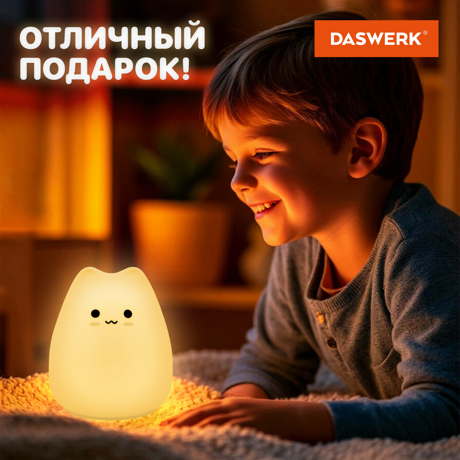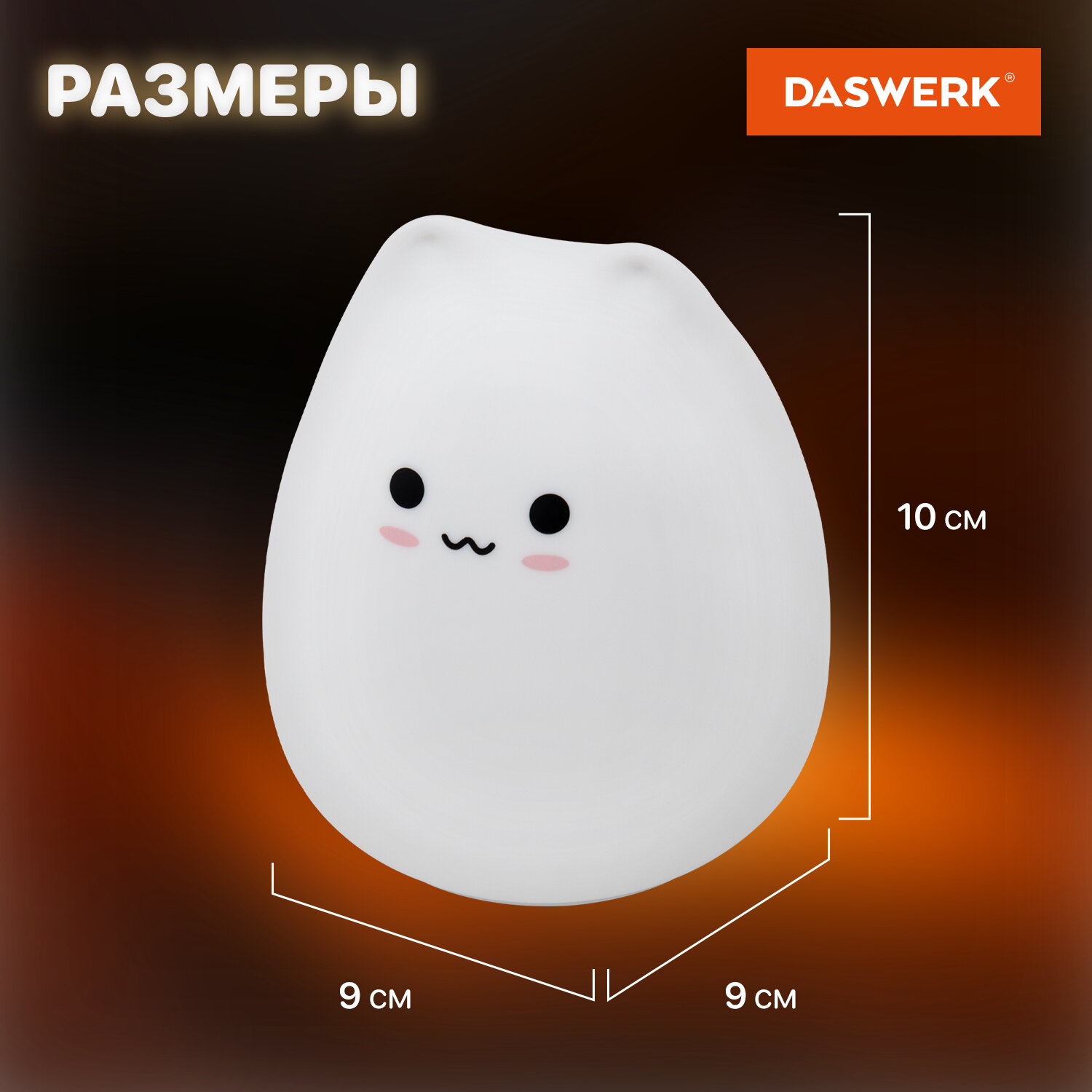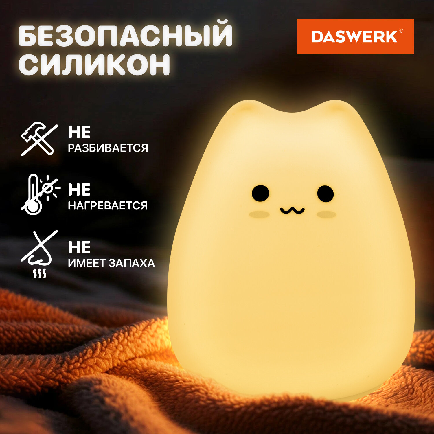 Силиконовый ночник DASWERK в очаровательном дизайне мягко рассеивает свет, создавая тёплую и спокойную атмосферу в любой комнате – будь то детская, спальня или гостиная. Корпус из приятного на ощупь силикона безопасен для самых маленьких, не нагревается и устойчив к деформации, поэтому его можно использовать даже как антистресс-игрушку. Если легко стукнуть по ночнику, он поменяет цвет.