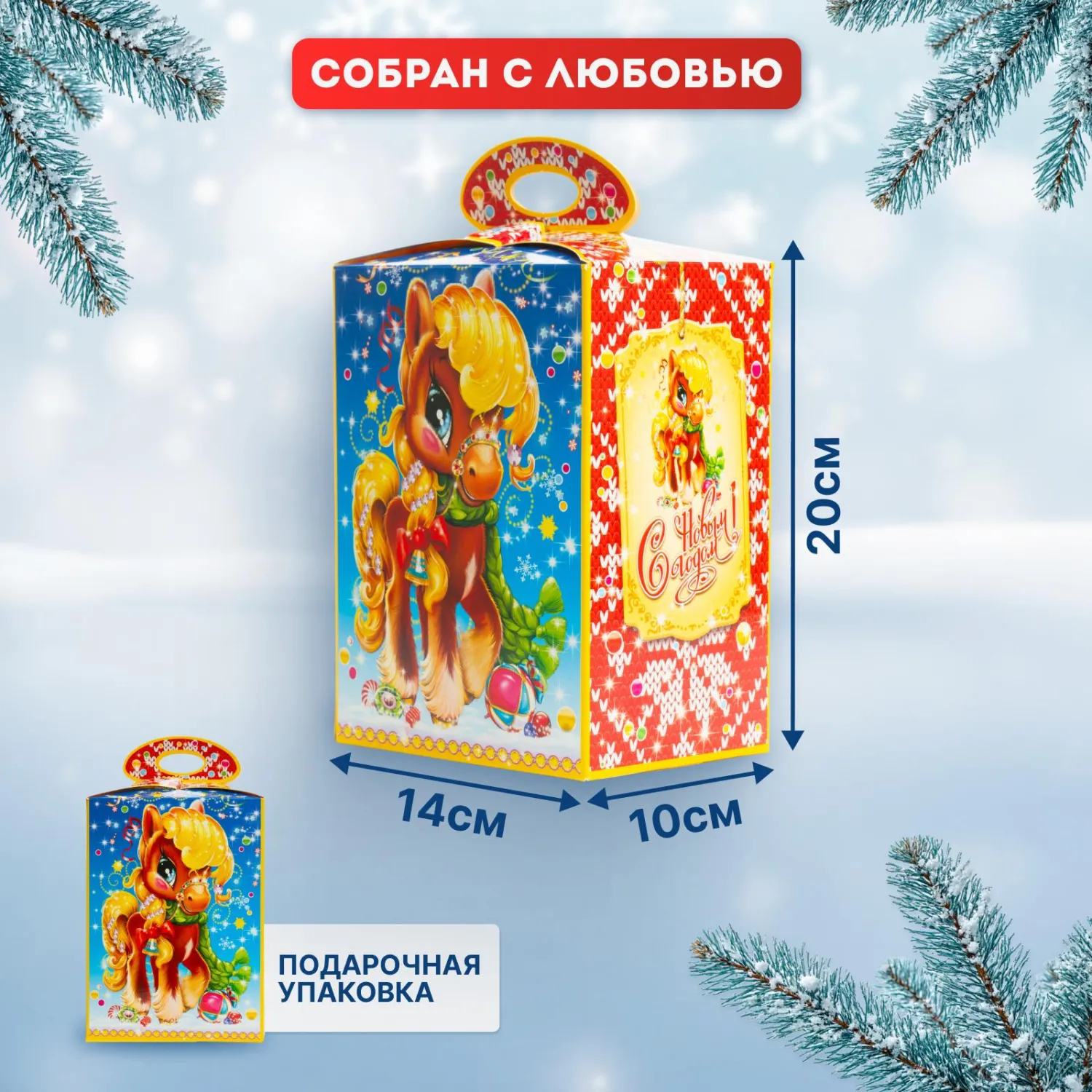 Новогодний сладкий подарок "Лошадка красавица«— красочная коробка, наполненная сладостями, которые дети обожают. Подарок, дарящий радость, улыбки и атмосферу настоящего чуда.