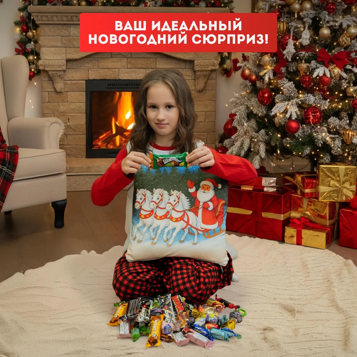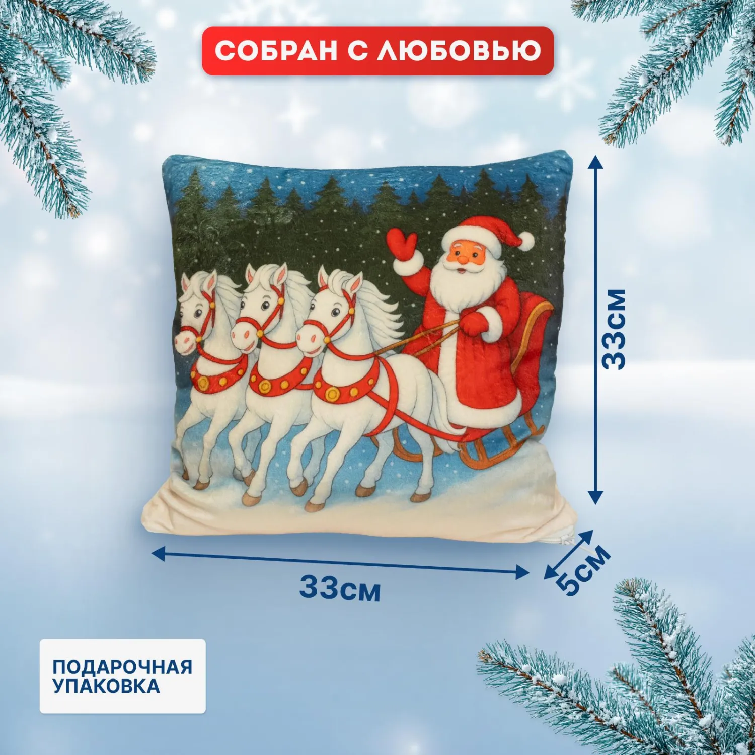 Новогодний сладкий подарок «Подушка-тройка» — мягкая и приятная упаковка с любимыми сладостями внутри. Идеальный выбор для тёплого и вкусного новогоднего сюрприза.