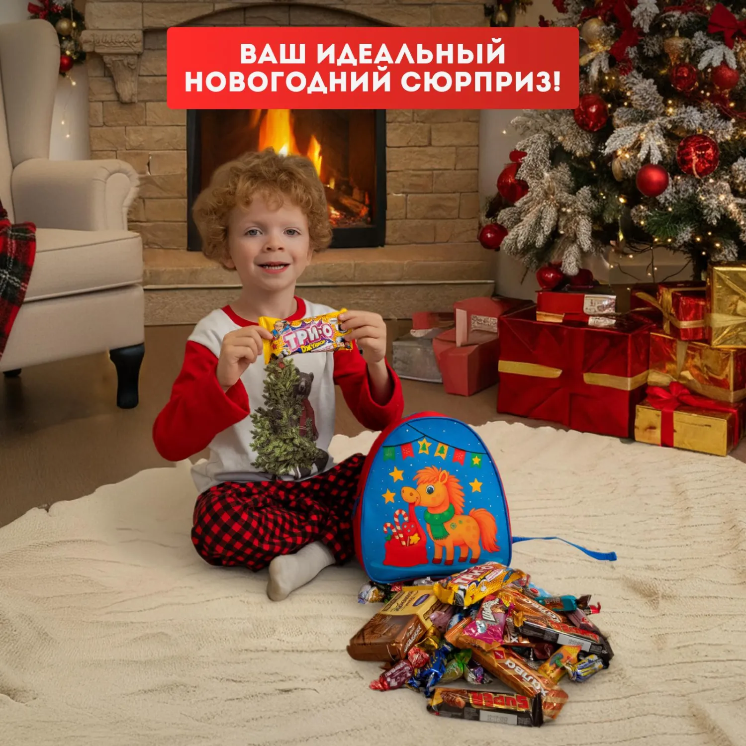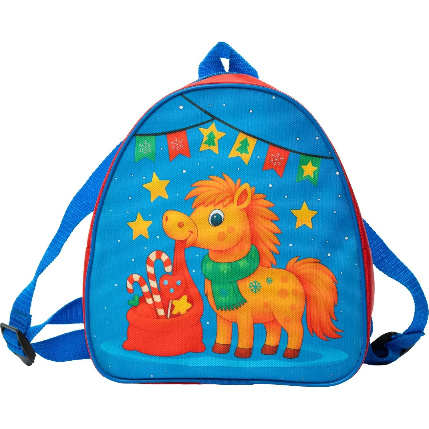 Новогодний сладкий подарок «Рыжик» — удобный рюкзак с изображением милого рыжего жеребёнка — не просто упаковка, а настоящий новогодний подарок! После того как сладости съедят, рюкзак станет любимым аксессуаром для прогулок, игр или хранения вещей — лёгкий, прочный и очень красивый.