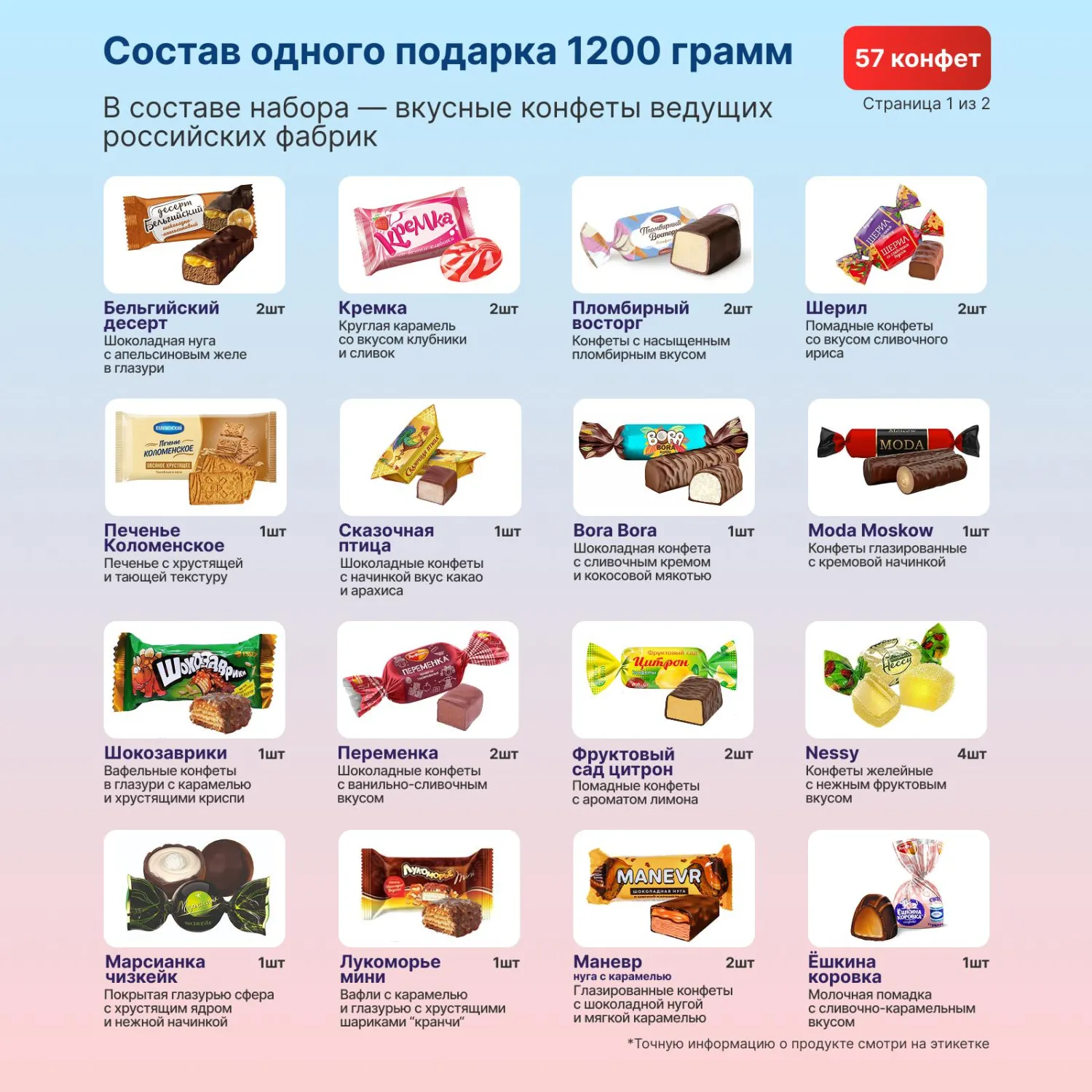 Внимание! Состав конфет в наборе может быть заменён на аналогичные позиции, в случае отсутствия у фабрики указанной конфеты на момент фасовки набора. Замена конфеты происходит с сохранением категории, ценового сегмента и вкусовых характеристик.