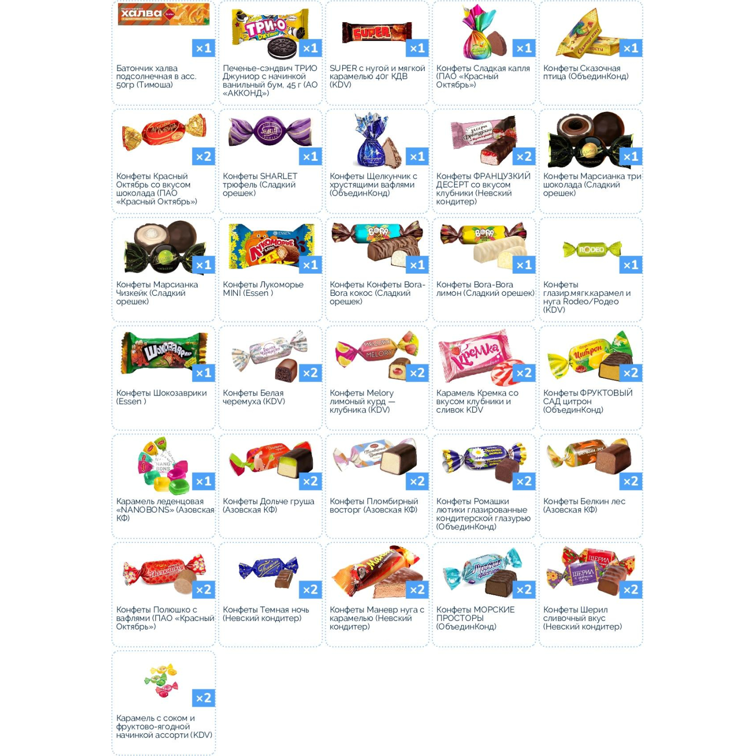 Внимание! Состав конфет в наборе может быть заменён на аналогичные позиции, в случае отсутствия у фабрики указанной конфеты на момент фасовки набора. Замена конфеты происходит с сохранением категории, ценового сегмента и вкусовых характеристик.